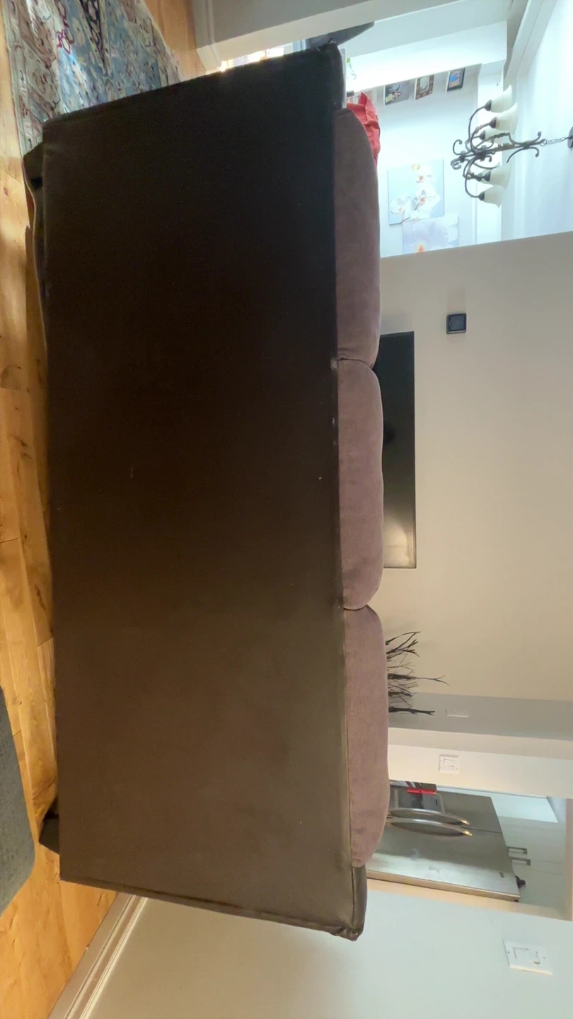 Comfortable three-seater sectional sofa with tufted grey fabric cushions and dark brown faux leather base. Small stains easy to fix on sofa, decent condition, bought for 800, need gone asap. PRICE NEGOTIABLE