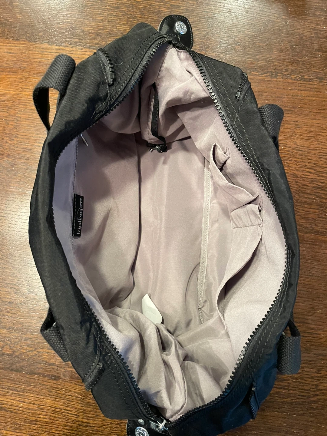 This is a black Kipling duffle bag. It's made of durable nylon material and includes a signature Kipling monkey charm. The bag features multiple zippered pockets and adjustable straps for comfortable carrying.