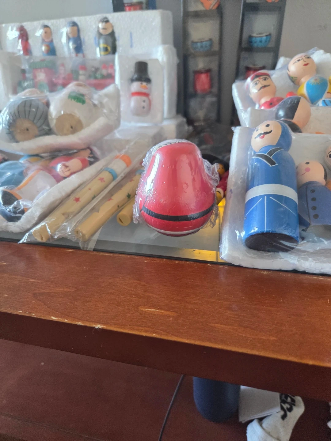A collection of charming wooden nesting dolls, including Santa Claus, and various other folk art-style figurines. These decorative pieces are perfect for display during the holiday season or as unique collectibles. Their intricate designs add a touch of cultural artistry to any home.
