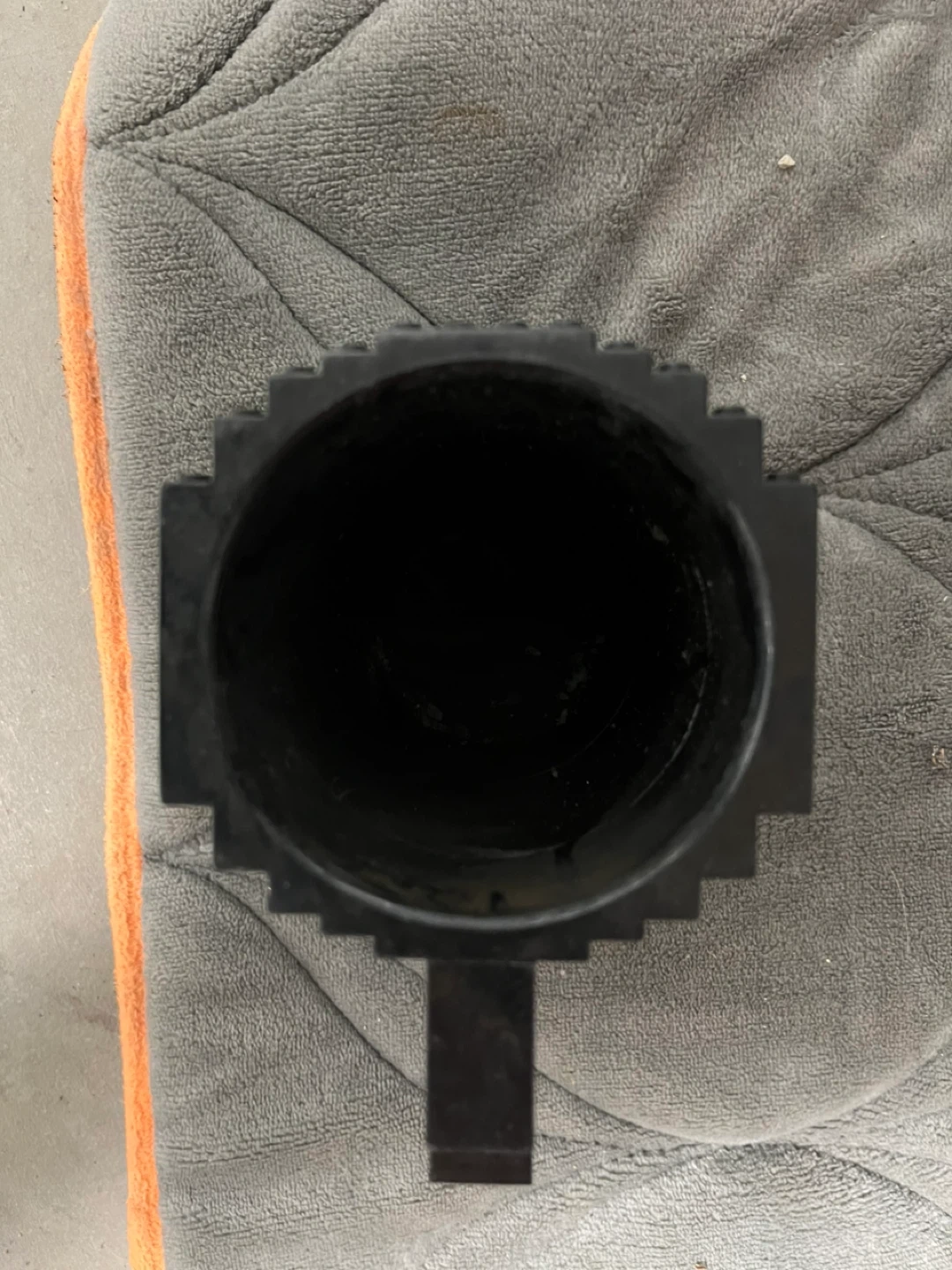 This is a black mug constructed from building block pieces. It has a handle and a cylindrical opening. Perfect for your morning coffee or tea!
