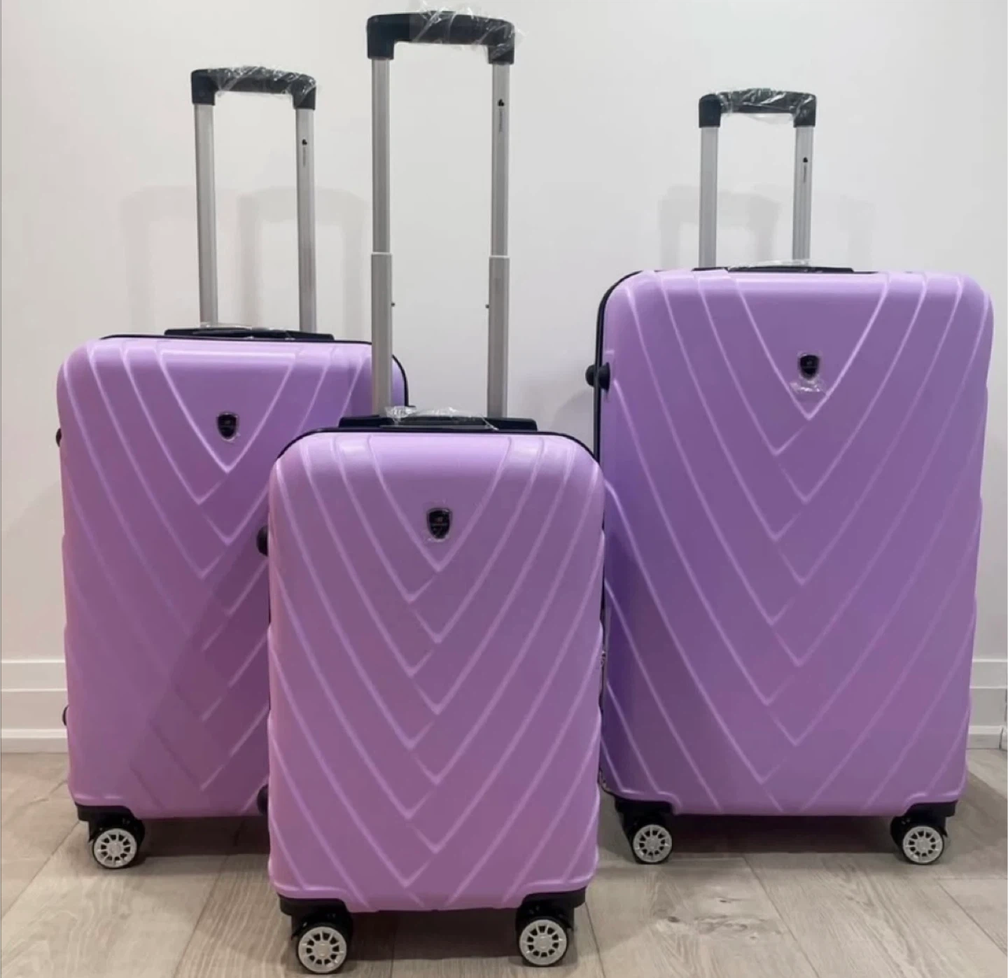 Selling a brand new 3-piece luggage set in a lovely purple colour! This set is perfect for all your travel needs. Each suitcase has a retractable handle and wheels for easy maneuvering. The interior is lined with a patterned fabric and includes straps to keep your belongings secure. They're brand new and ready for your next adventure