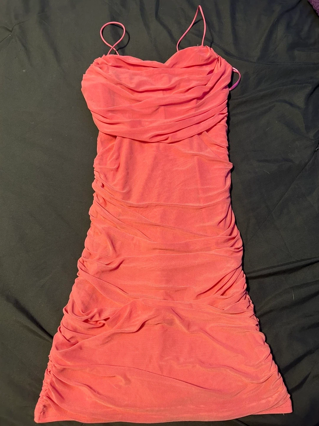 A pink ruched mini dress with spaghetti straps. It's made of a stretchy, sheer fabric. This dress is perfect for a night out!