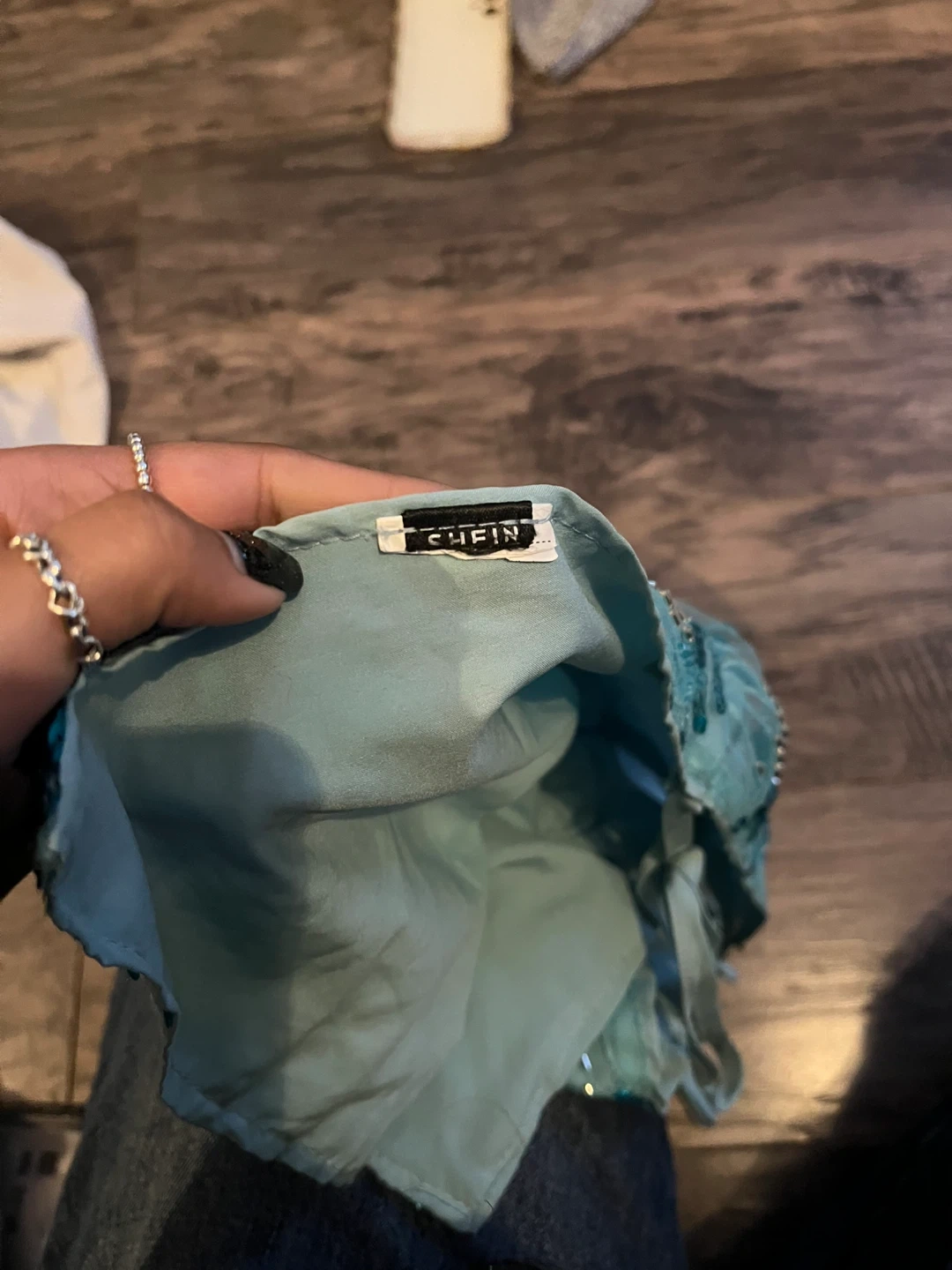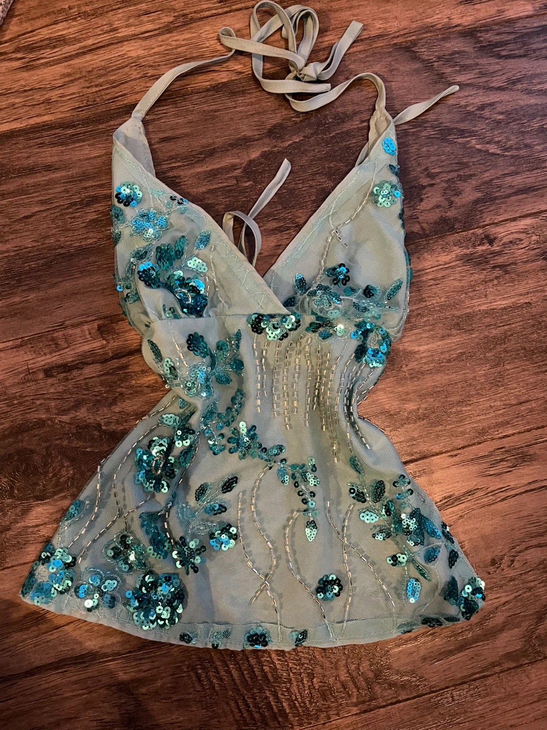 Light blue halter top with all-over sequin and beads, similar to the top from peppermayo. Perfect for a night out. It’s not damaged and has been worn once. Comes from a smoke free and pet free home
