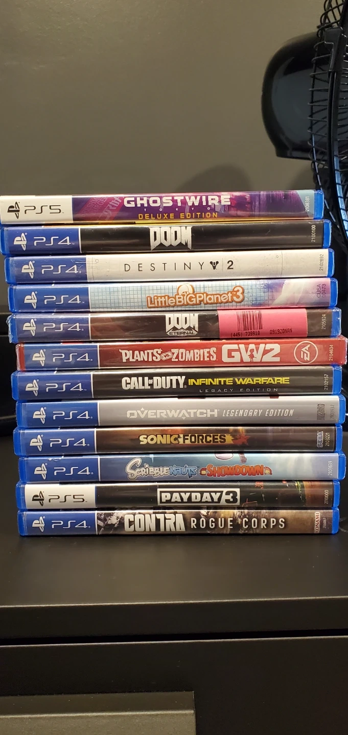 Selling a wide range of ps4 and ps5 games that I either dont play anymore or just dont have any use for. Games like Ghostwire: Tokyo Deluxe Edition, Doom (2016), Doom Eternal (Sealed), Destiny 2, LittleBigPlanet 3, Plants vs. Zombies GW2 (Sealed), Call of Duty Infinite Warfare, Overwatch Legendary Edition, Sonic Forces, Scribblenauts Showdown, Payday 3, and Contra Rogue Corps. These are the physical that are either lightly used and in good condition or brand new and sealed. DM if interested (prices vary by game)