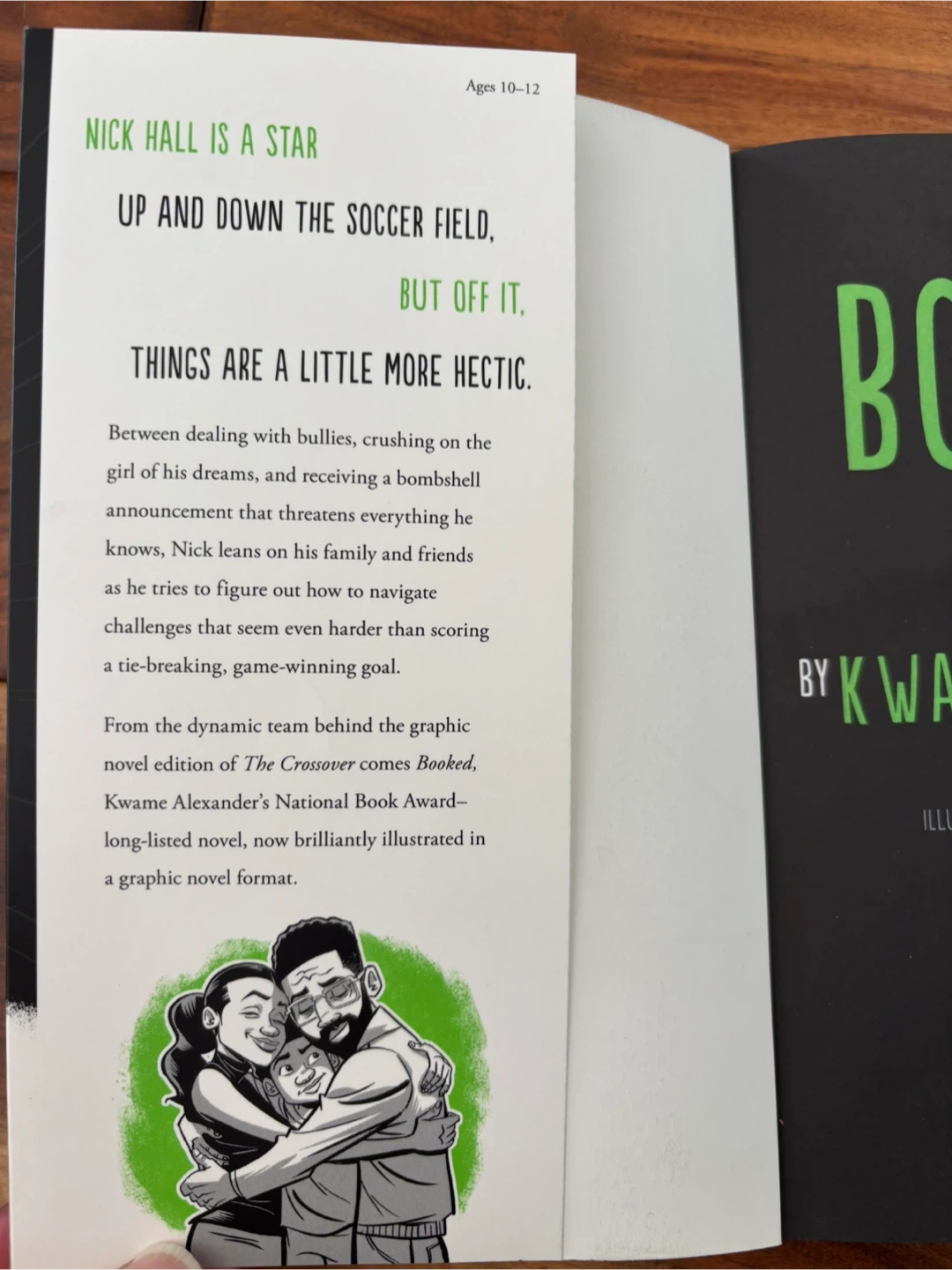 The graphic novel adaptation of Kwame Alexander's New York Times bestseller, Booked. Nick Hall is a star up and down the soccer field but off it, things are a little more hectic. Between dealing with bullies, crushing on the girls of his dreams, and receiving a bombshell announcement that threatens everything he knows, Nick leans on his family and friends as he tries to figure out how to navigate challenges that seem even harder than scoring a tie-breaking, game-winning goal. It's recommended for ages 10-12.