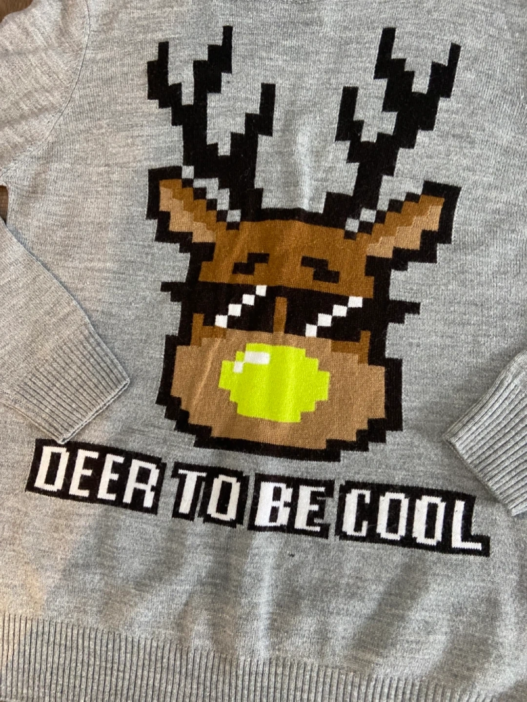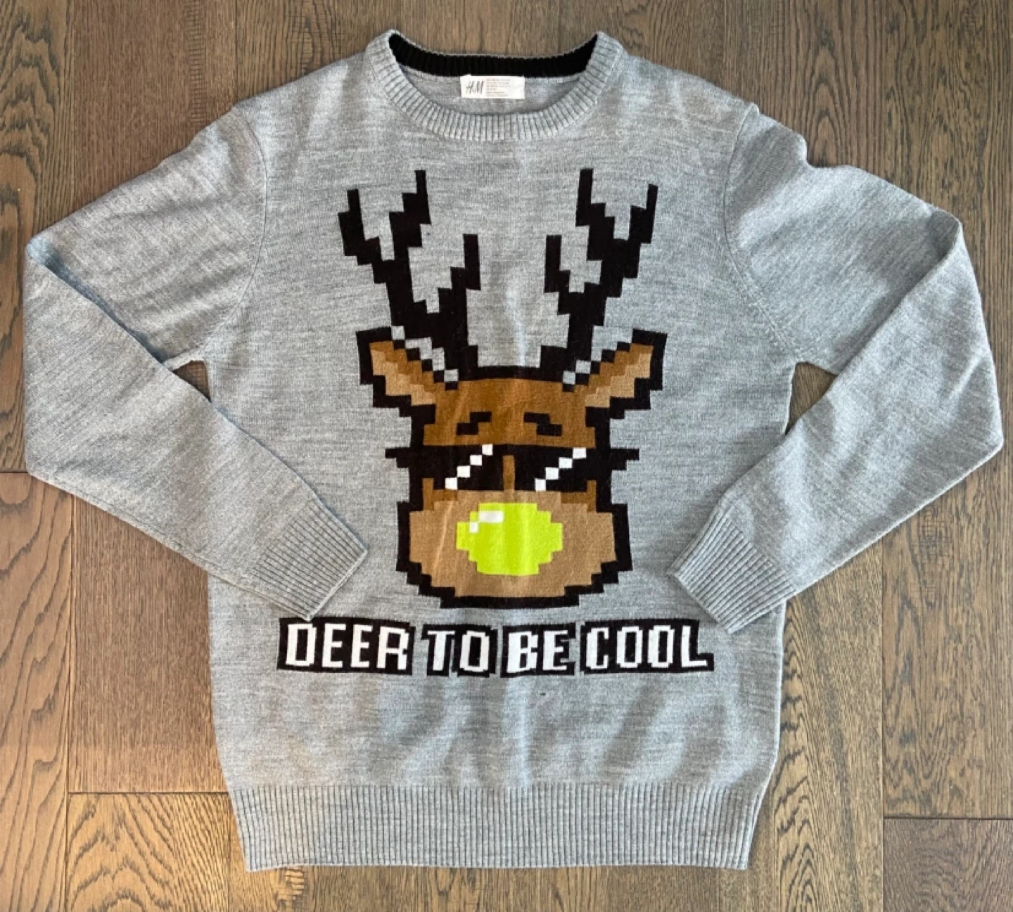 This H&M sweater features a fun pixelated reindeer graphic with sunglasses and the slogan "DEER TO BE COOL". It's a grey, long-sleeved knit suitable for casual wear. Made from 100% acrylic.