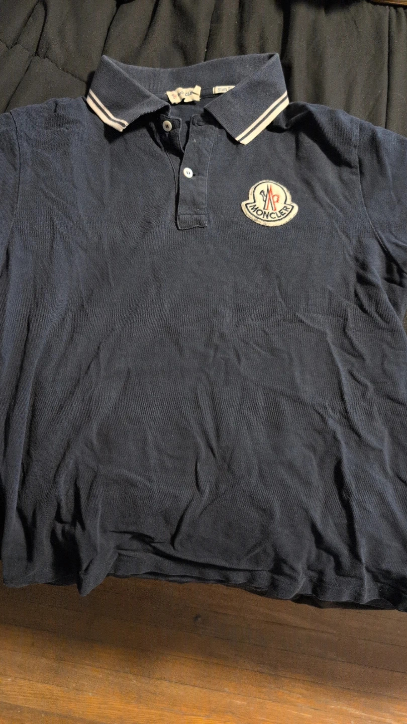 This is a Moncler navy blue polo shirt with white trim on the collar and cuffs. It features the iconic Moncler logo patch on the chest. Made from comfortable cotton material. Perfect for casual wear.