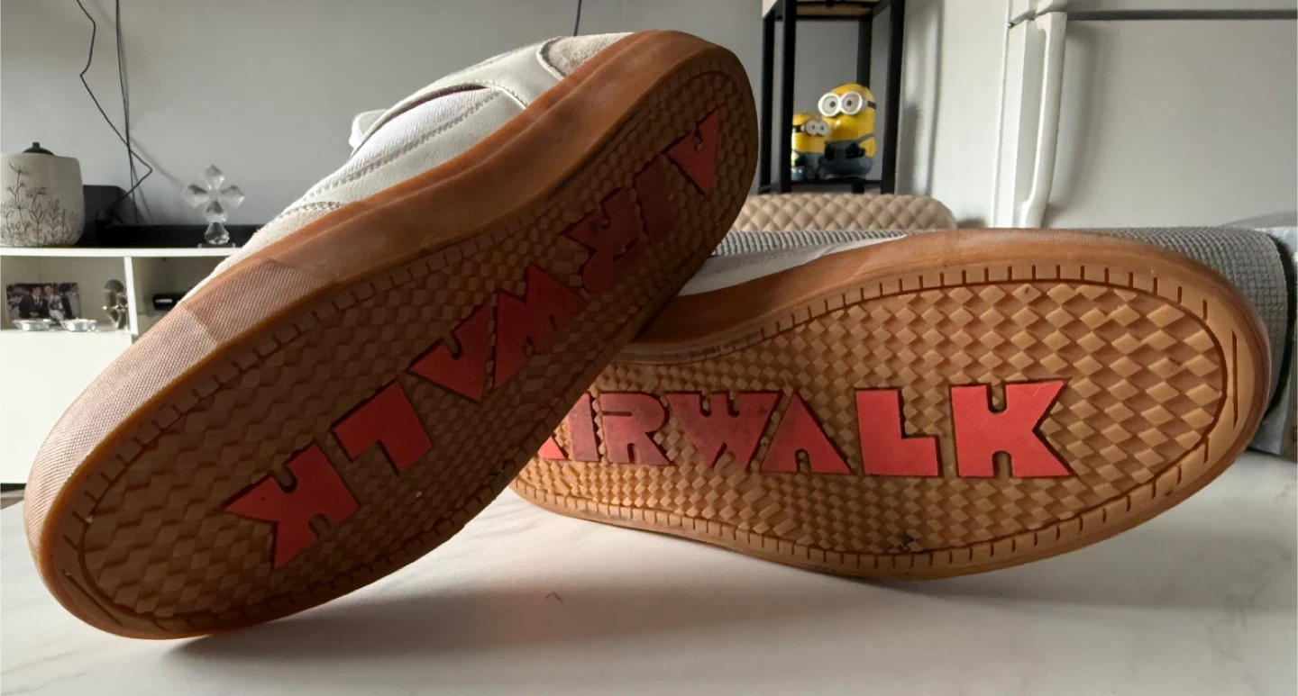 These Airwalk sneakers feature a white canvas and tan suede design. They have a classic lace-up closure and a durable gum sole. Perfect for casual wear!
