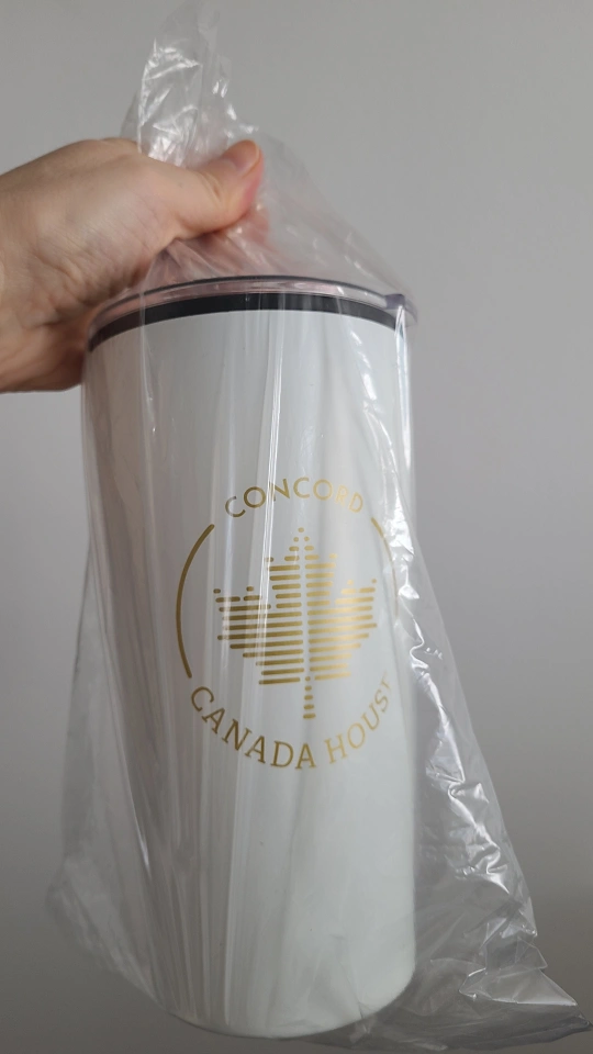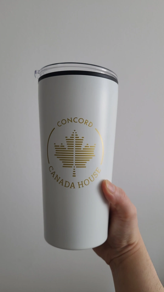 This white Concord Canada House travel tumbler features a gold maple leaf logo. It comes with a spill-resistant lid.