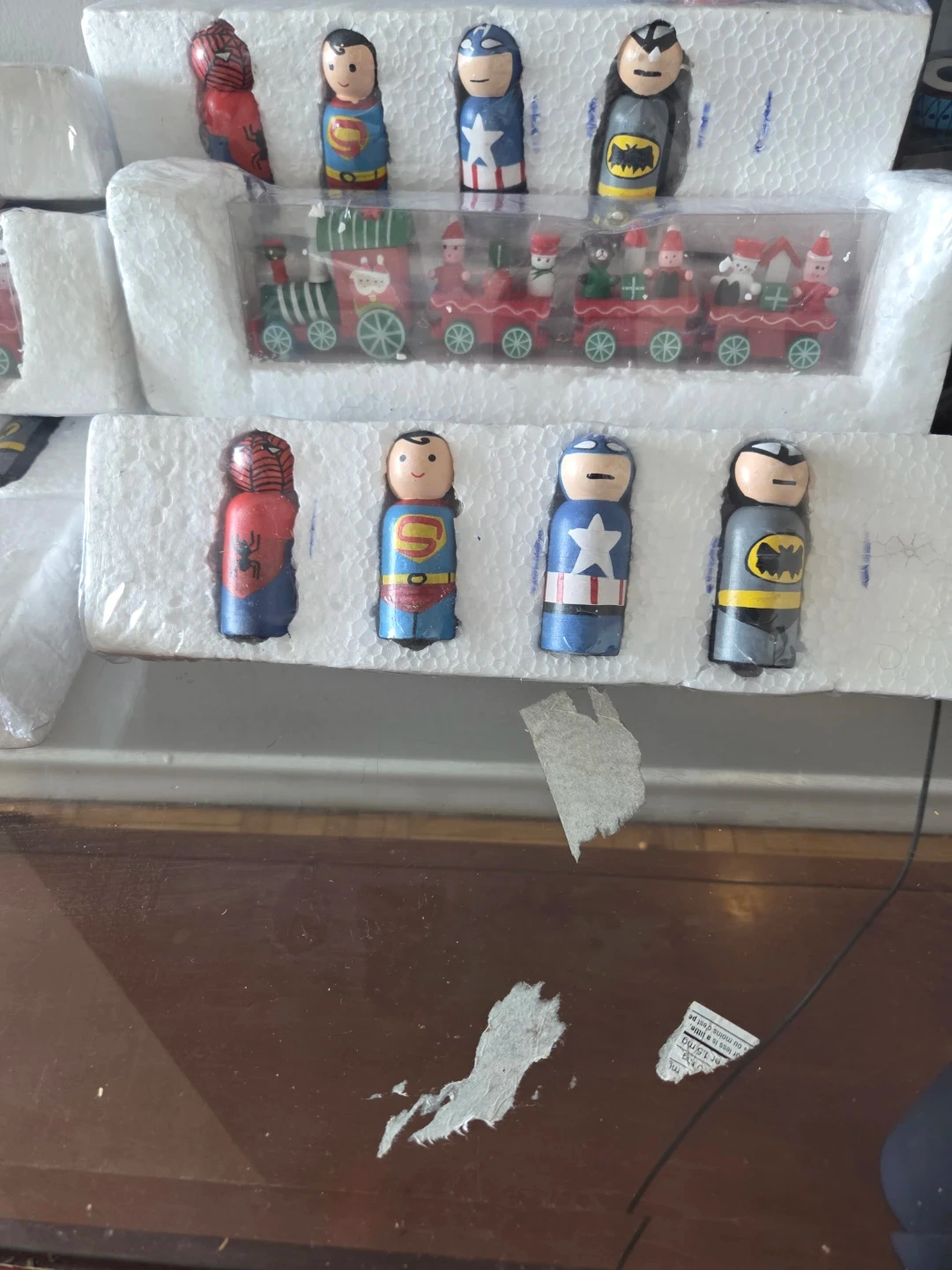 This set includes several superhero figurines like Superman, Captain America, Batman, and Spider-Man. It also features a festive Christmas train with characters. These wooden peg-style figures are great for display or play!