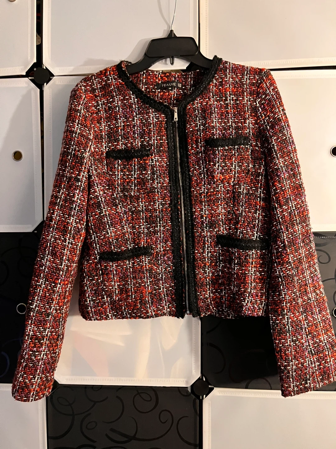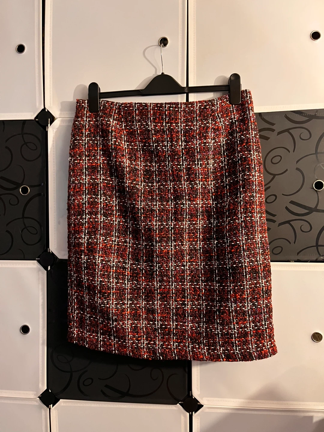 This women's blazer and skirt set comes in a red, black, and white tweed pattern. The blazer features a zippered front and faux pockets with black trim. The skirt is a knee-length pencil style. It's a stylish and classic matching outfit!