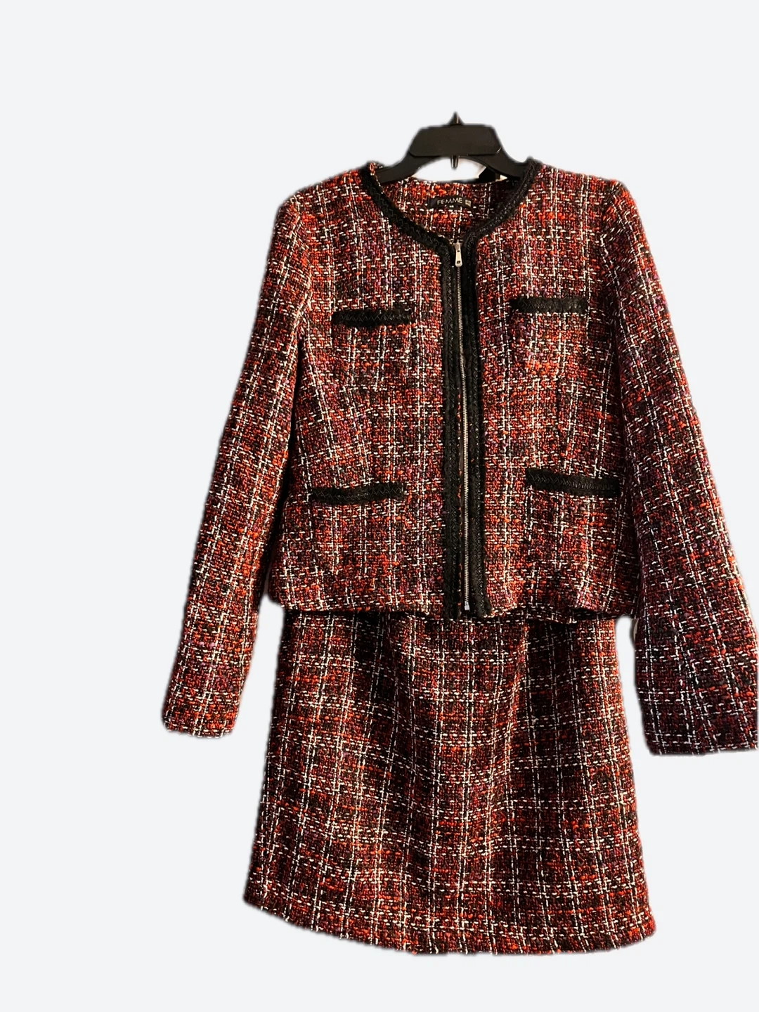 This women's blazer and skirt set comes in a red, black, and white tweed pattern. The blazer features a zippered front and faux pockets with black trim. The skirt is a knee-length pencil style. It's a stylish and classic matching outfit!