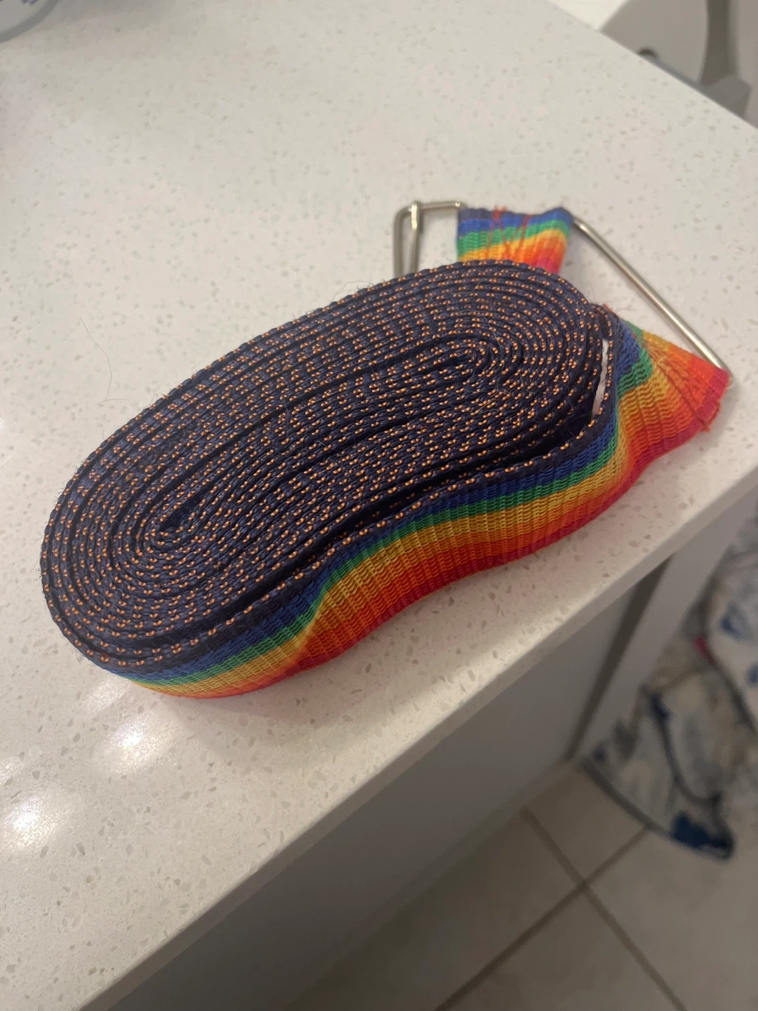 This is a durable strap with a vibrant rainbow pattern. It features a sturdy metal buckle for secure fastening. The strap is made of woven material and is coiled for storage. It's approximately 1 inch wide.