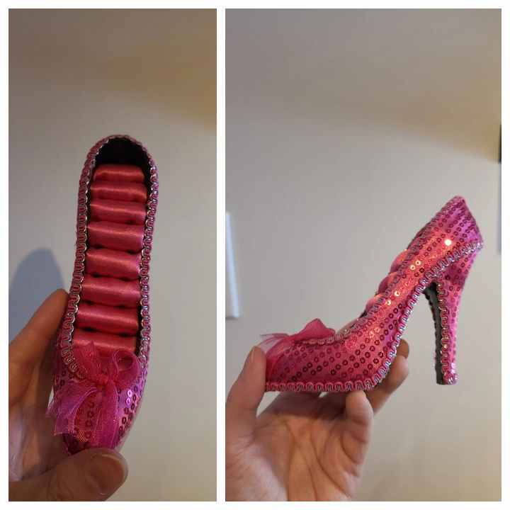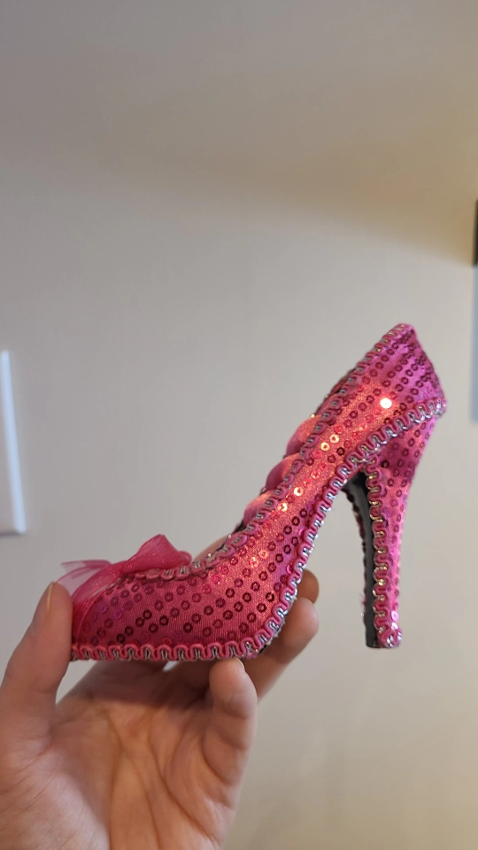 This decorative high heel shoe is covered in pink sequins. It has a satin-lined interior with multiple slots for holding rings. A small pink ribbon bow adorns the toe.