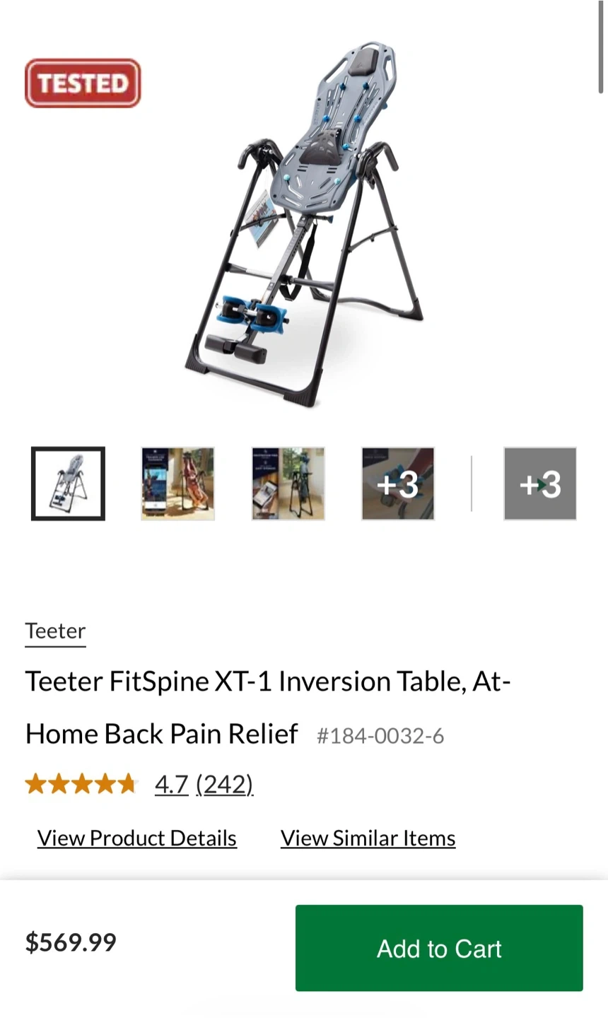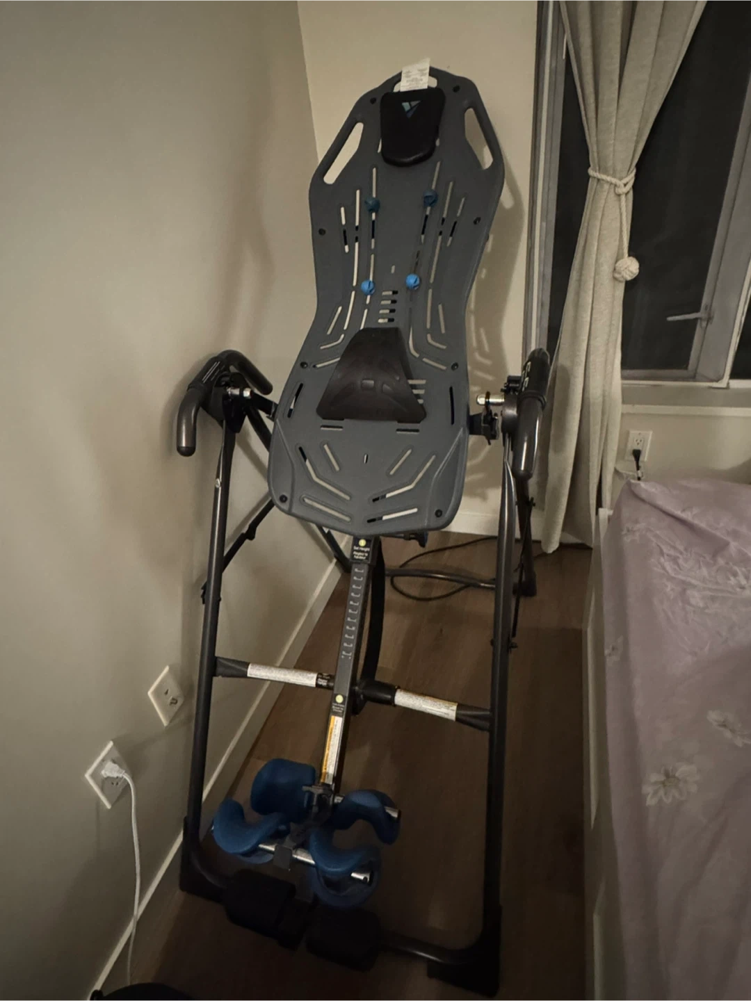 This Teeter FitSpine XT-1 inversion table is designed for at-home back pain relief. It's great for decompressing your spine and muscles. The table's frame is made of durable steel.