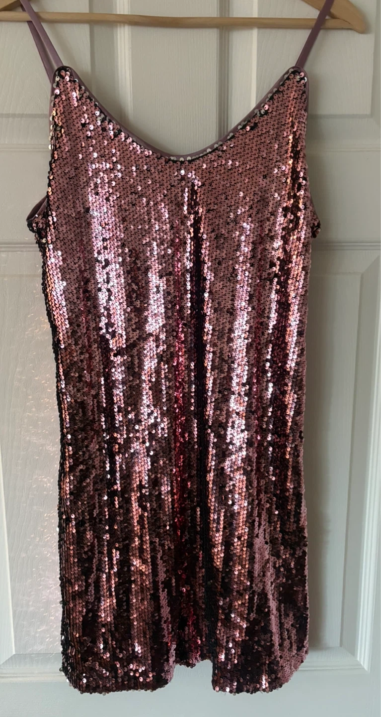 Sparkly sequin pink dress size small . It has adjustable spaghetti straps and a flattering V-neckline.