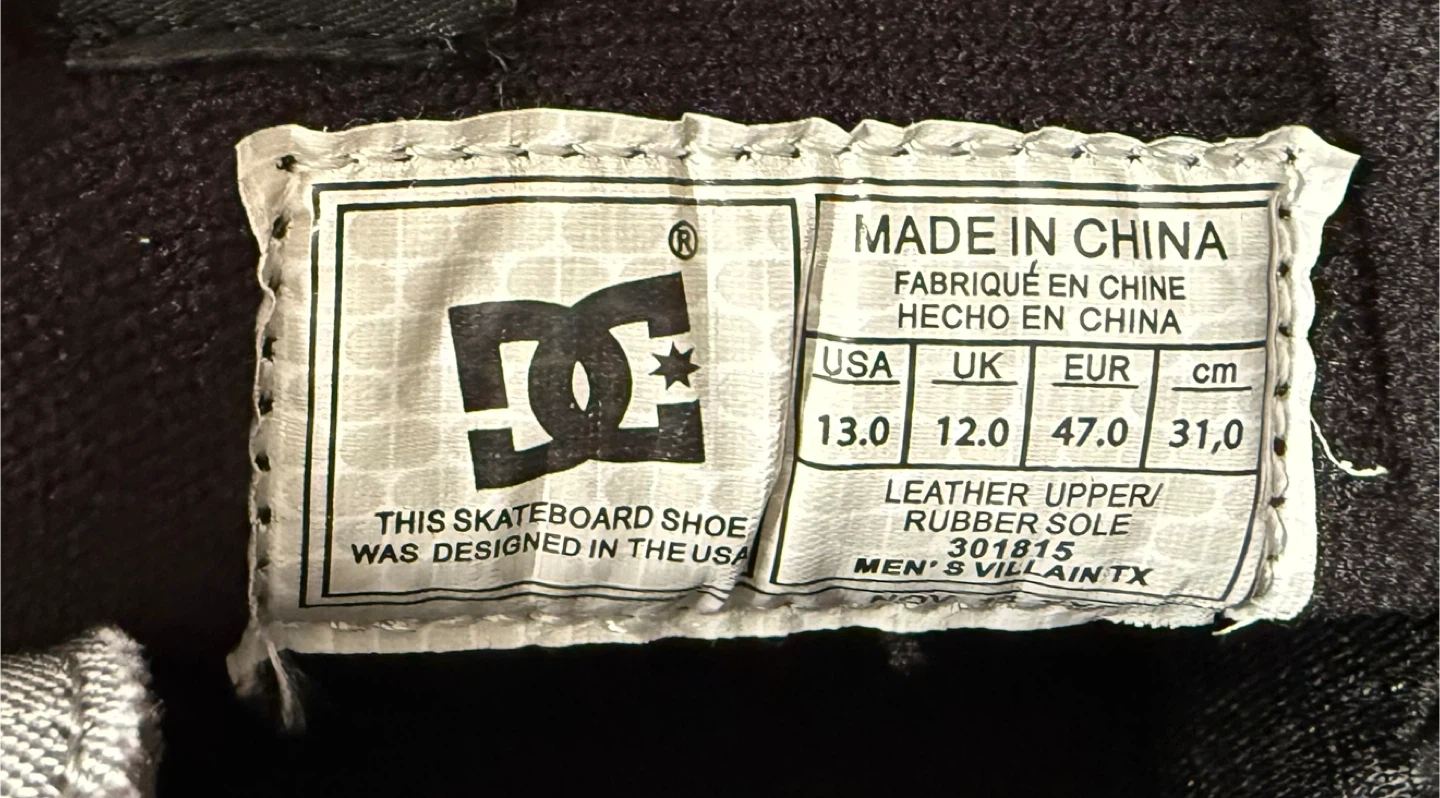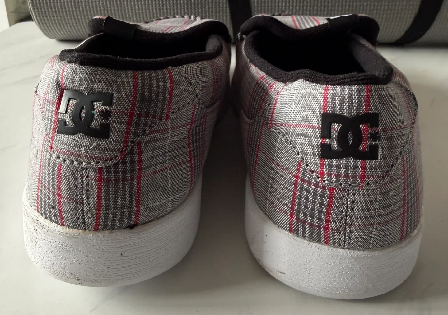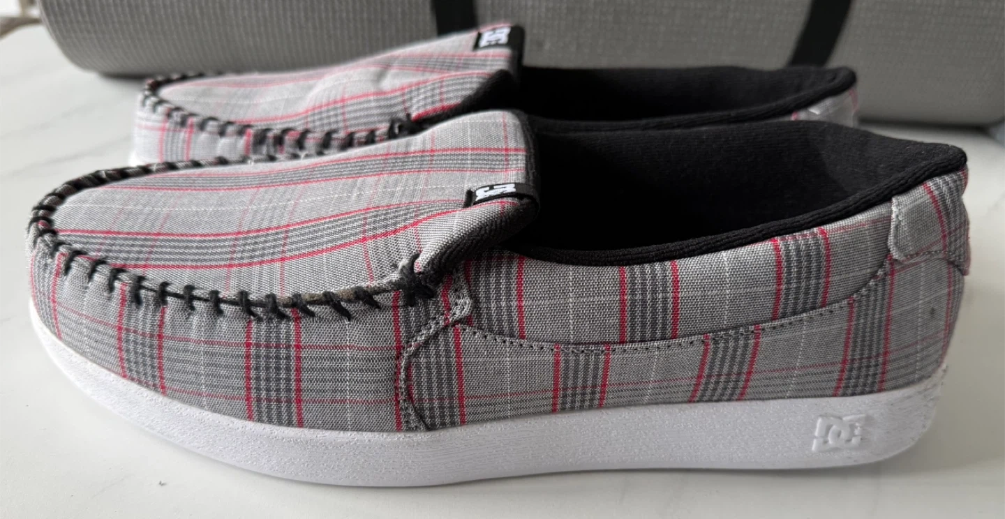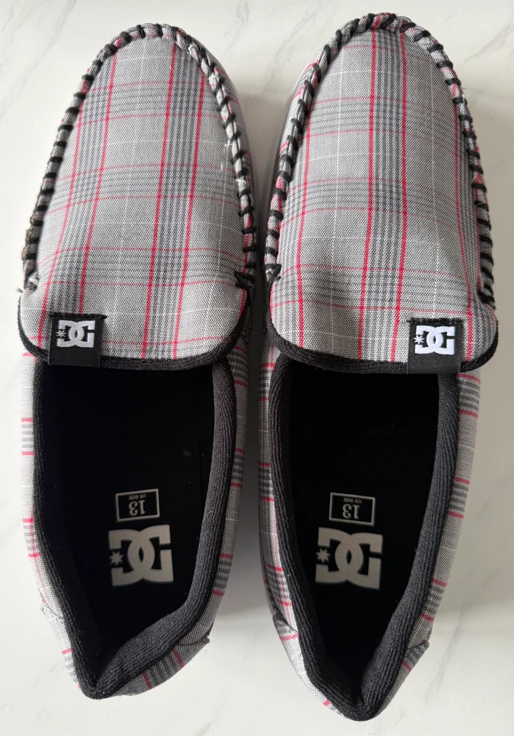 These DC Shoes feature a grey plaid pattern with red and black accents. They're a slip-on moccasin style with a black interior lining. Size 13.