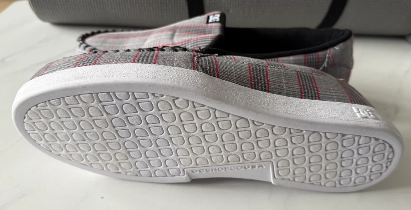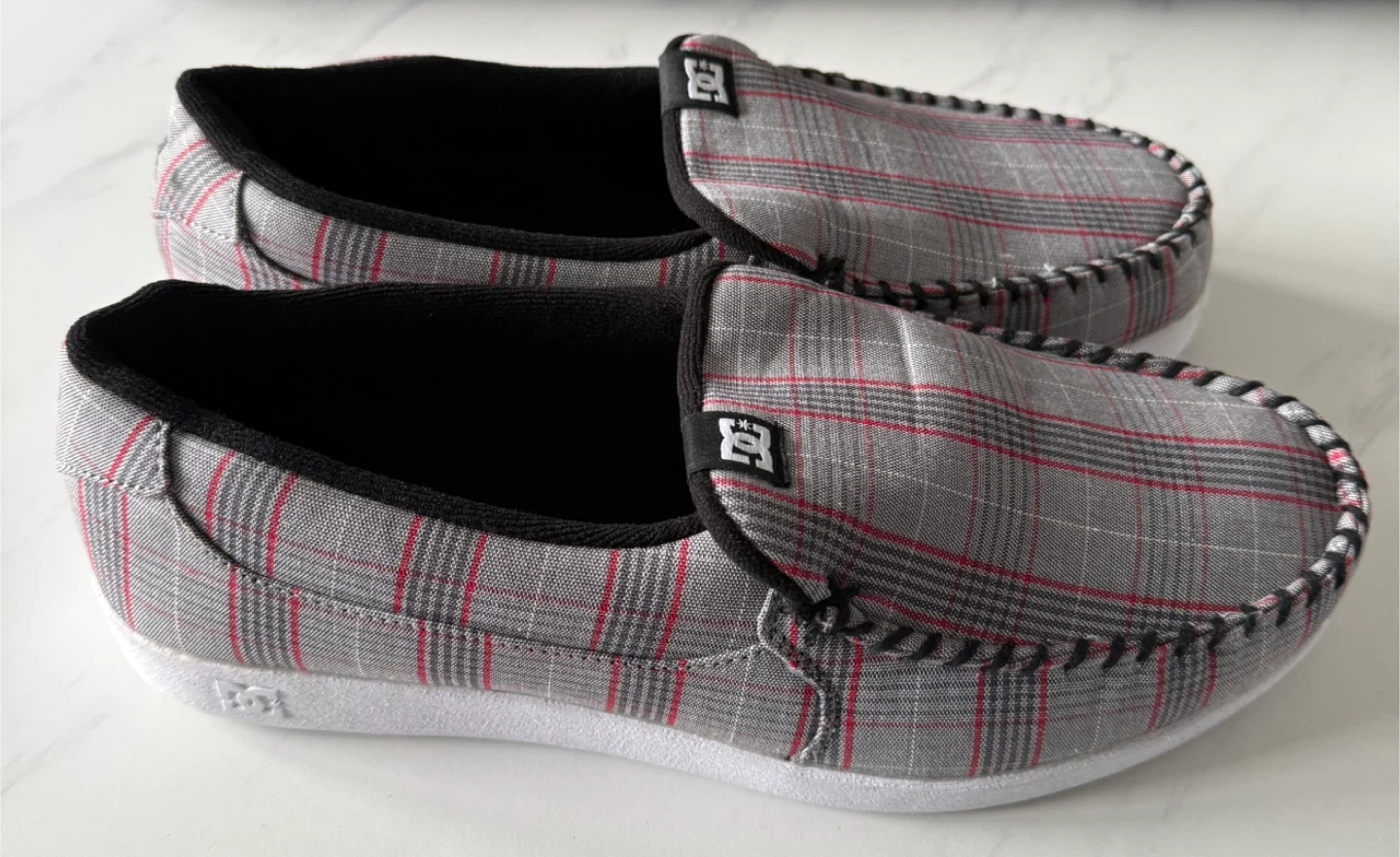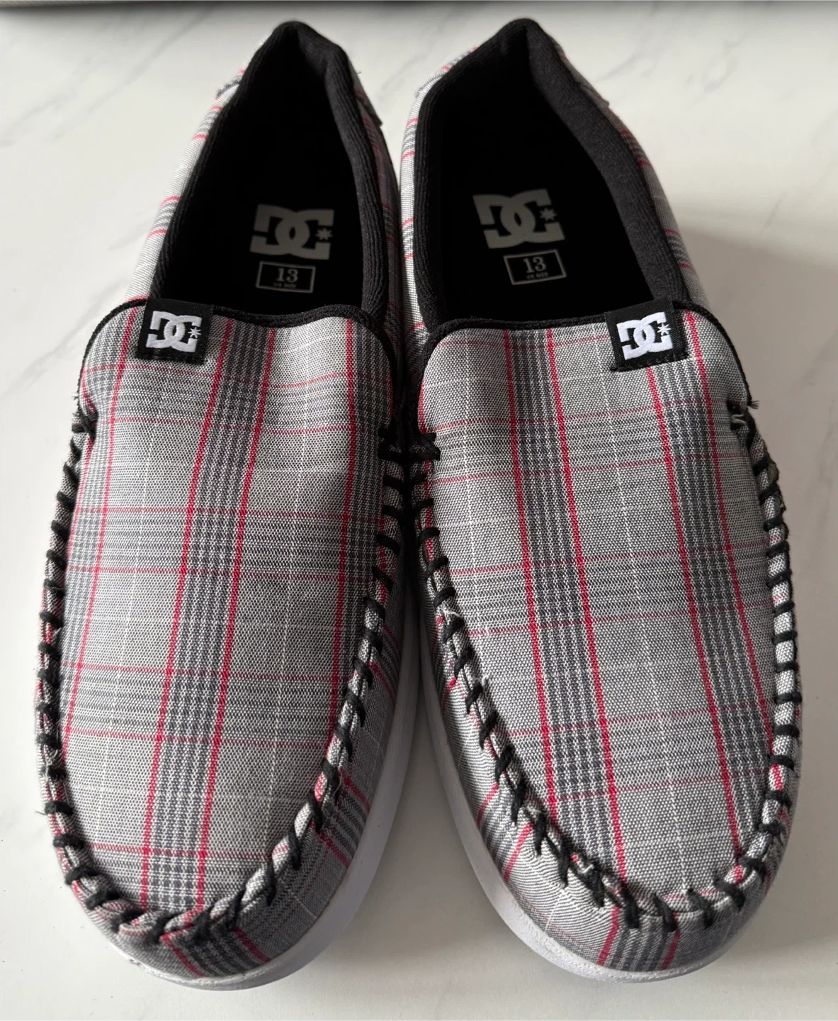 These DC Shoes feature a grey plaid pattern with red and black accents. They're a slip-on moccasin style with a black interior lining. Size 13.