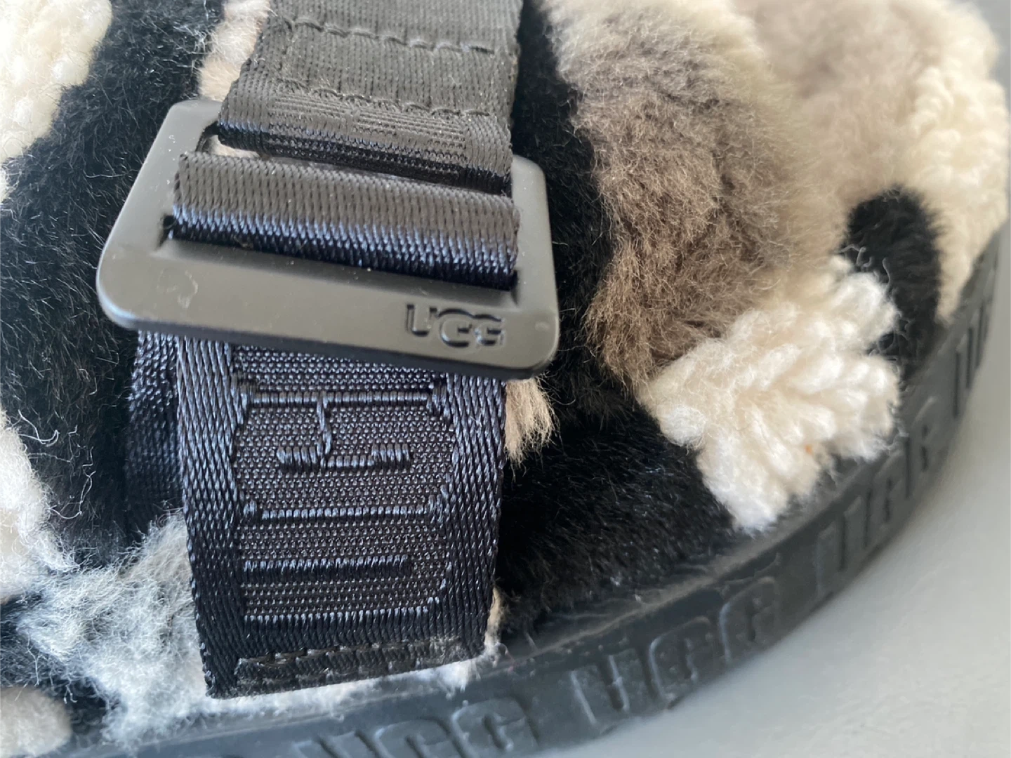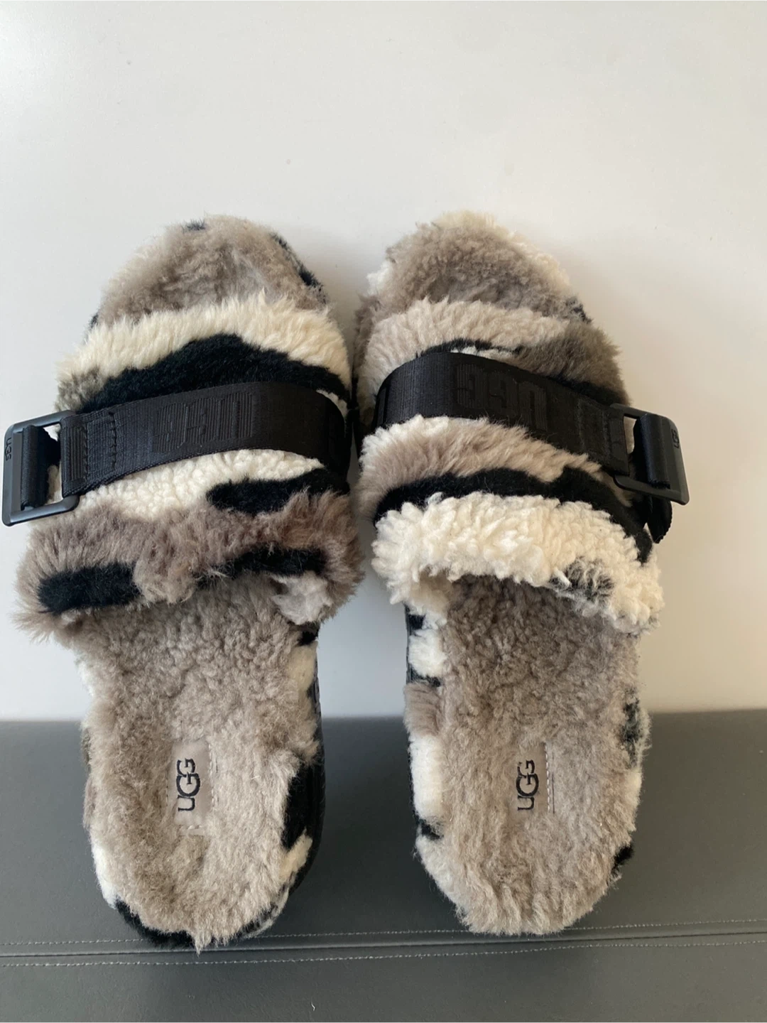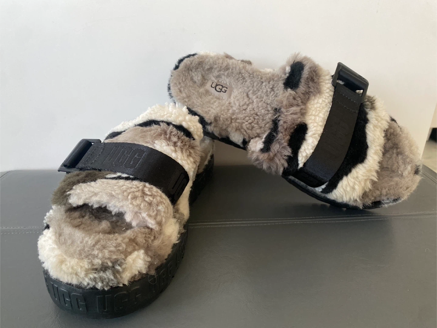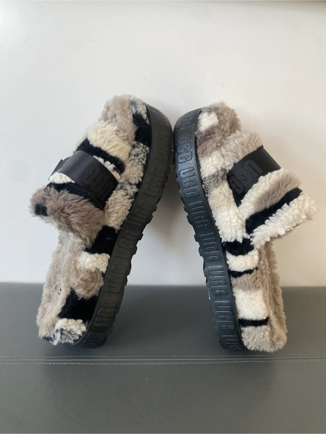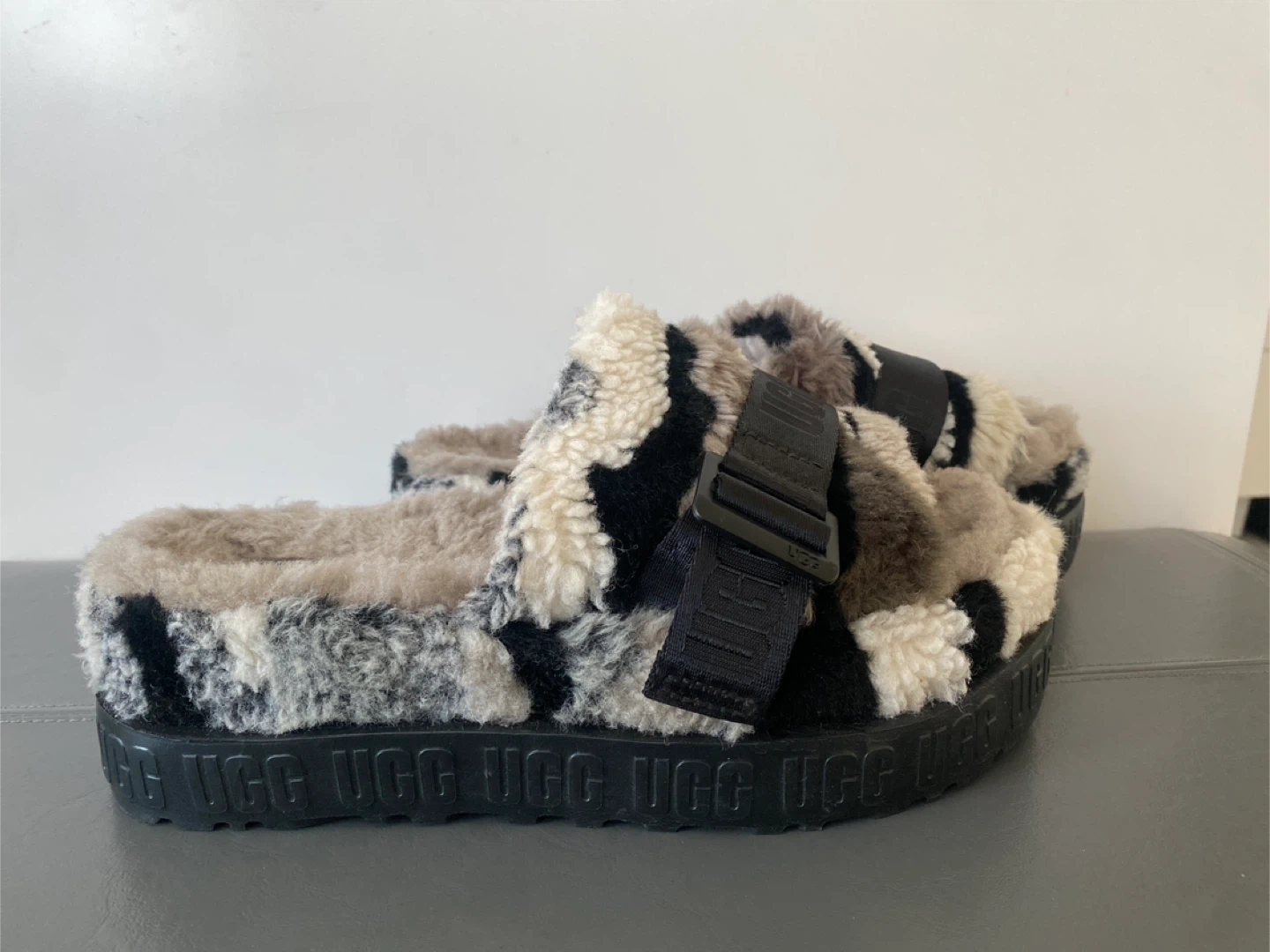Ugg Fluff Yeah slides in a fun camouflage pattern. These fuzzy slides are super comfy and stylish. They have adjustable ankle straps and a thick platform sole with UGG branding.