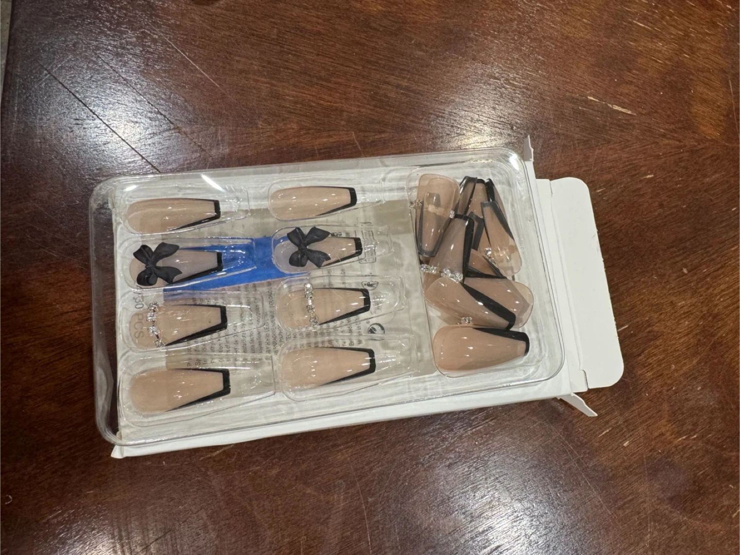 A collection of press-on nails featuring various designs. Includes styles with black bows, clear gems, and floral accents. These nails are ready to apply for a quick manicure upgrade!