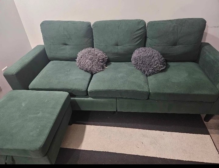 A green sectional sofa with a matching ottoman. Upholstered in a soft fabric. Includes two fluffy grey accent pillows.
