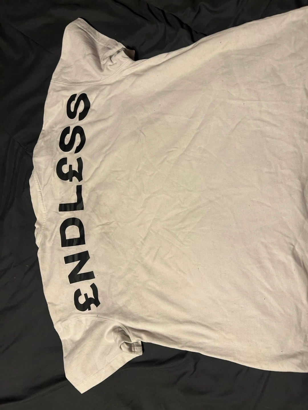 This is an ENDLESS. t-shirt. It's white with a graphic logo on the chest and a large ENDLESS. logo on the back. It's a casual tee for everyday wear.