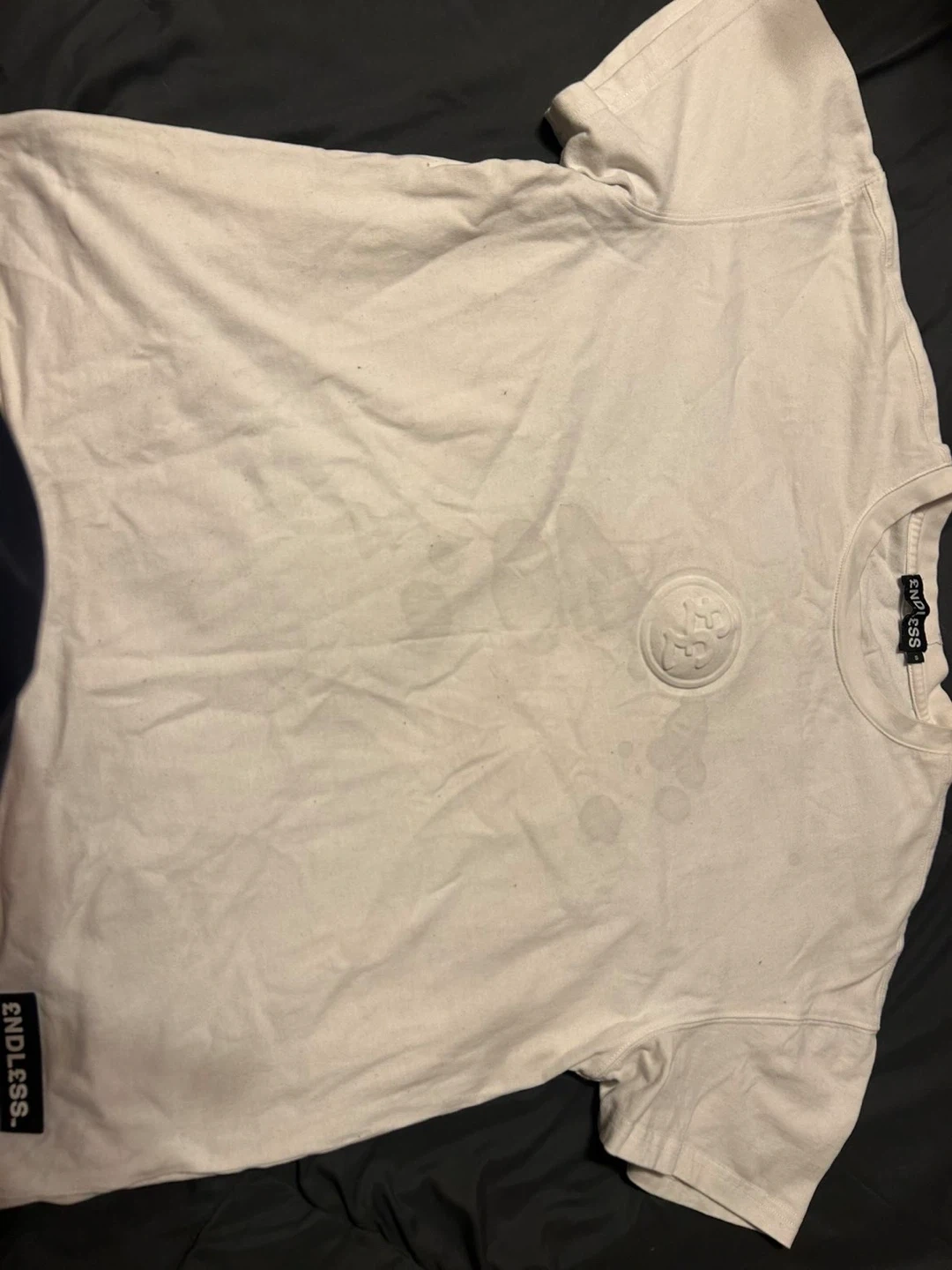 This is an ENDLESS. t-shirt. It's white with a graphic logo on the chest and a large ENDLESS. logo on the back. It's a casual tee for everyday wear.
