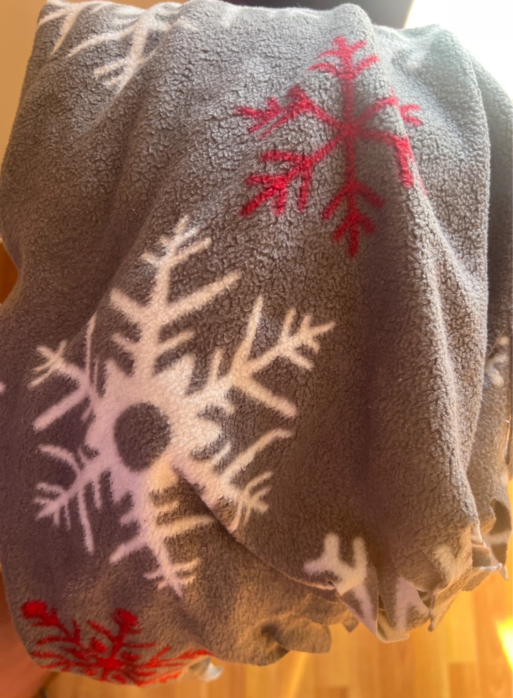 Cozy grey fleece blanket featuring a festive snowflake pattern with white and red accents. It's soft and warm, perfect for staying snug during colder months. Material is polyester fleece.