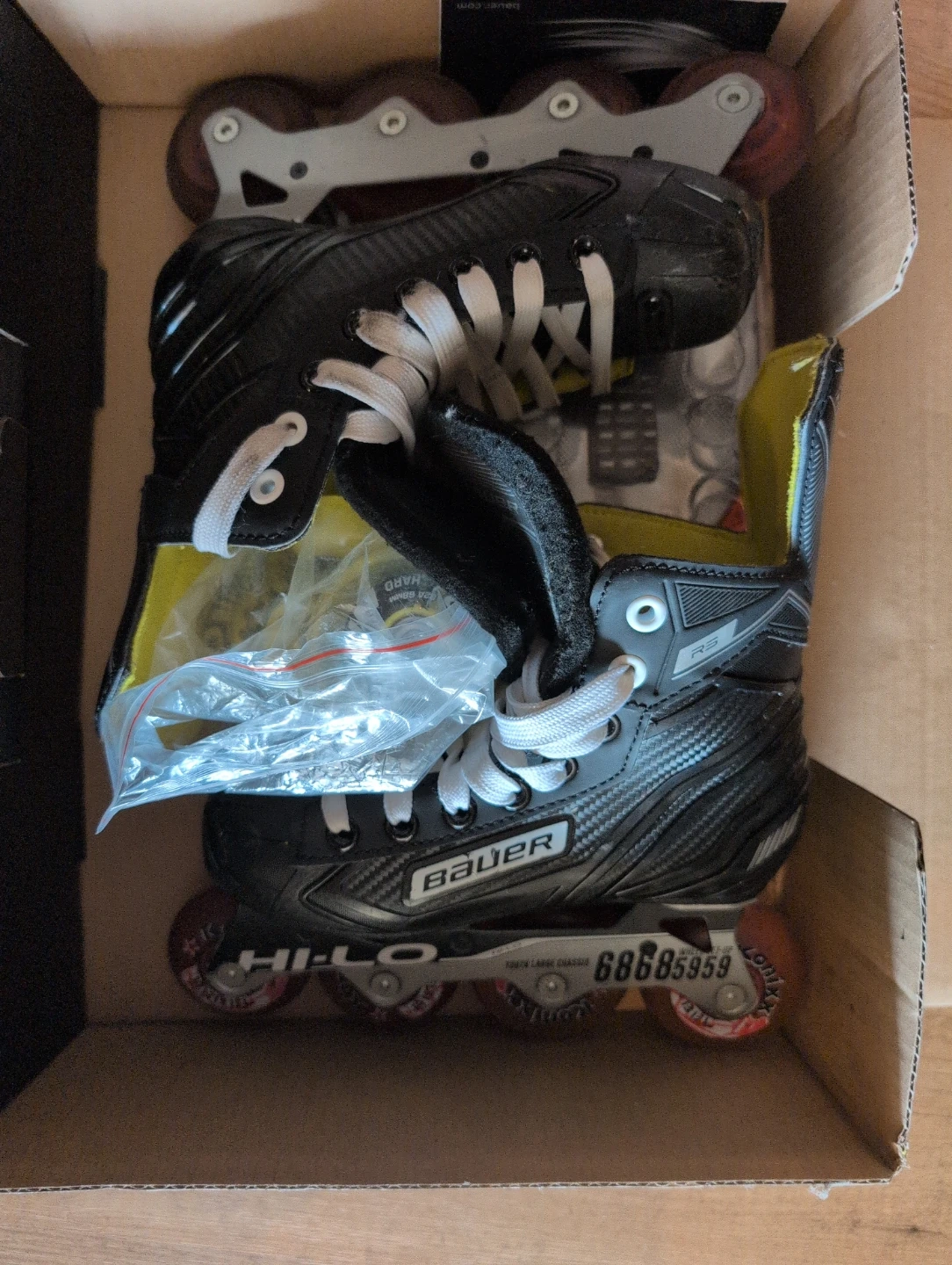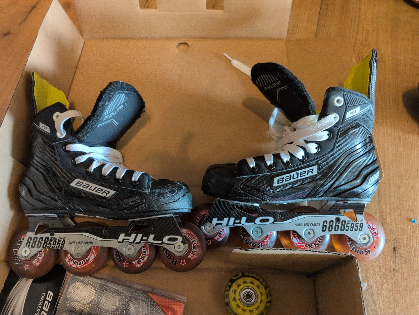 Bauer RS youth roller hockey skates. These skates are size 1.0 (US Youth 2.0, EUR 33.5, CM 21.0). They feature a Hi-Lo Youth Large Chassis and extra set of wheels. Excellent shape. Used less than 10 times.