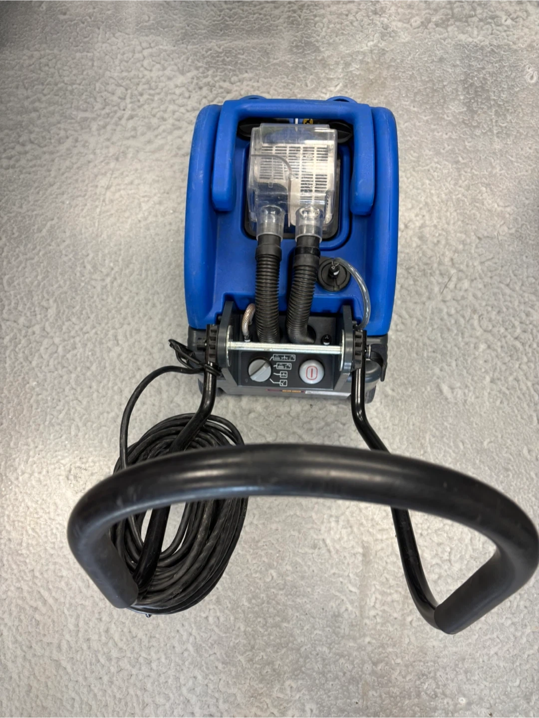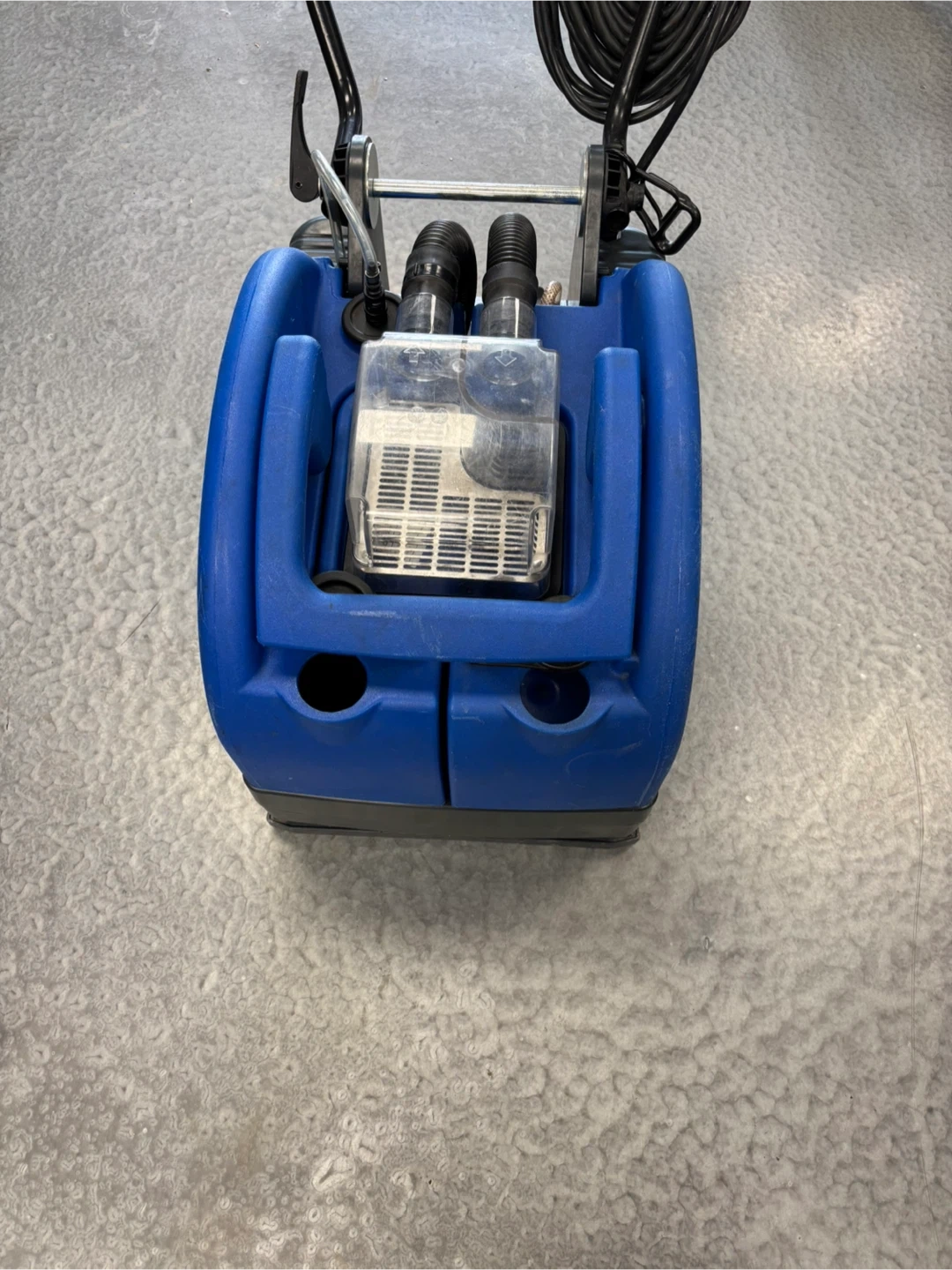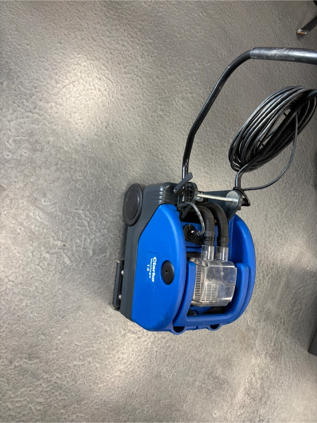 This is a Clarke Vantage 13 floor scrubber. It's a blue and black unit with a handle and wheels for mobility. It has hoses and a clear tank for water or cleaning solution. Absolutely perfect working condition if you like to come and test the unit before purchase, I am located at.410 16 Ave NE Trans-Canada Building free parking in the back