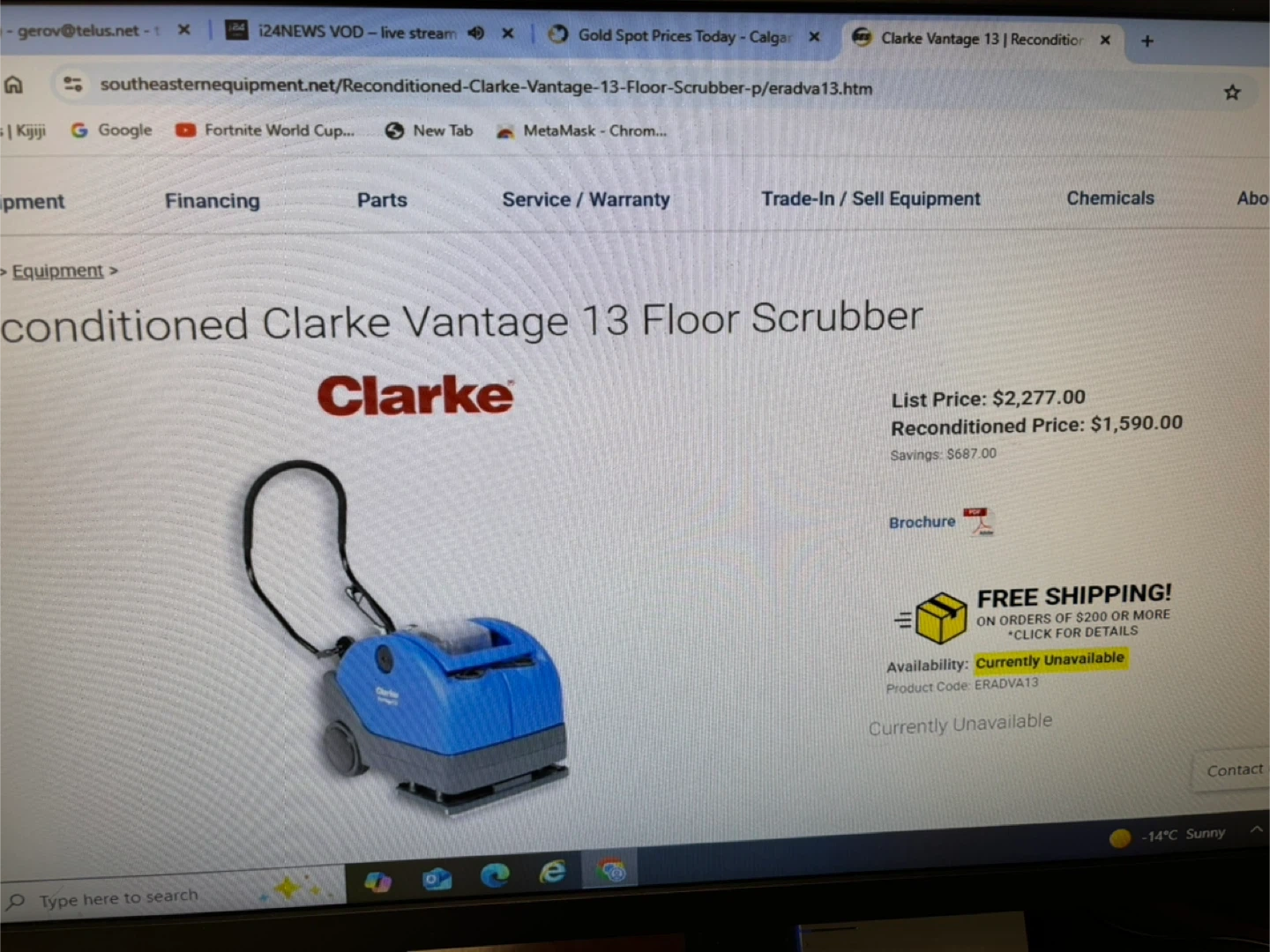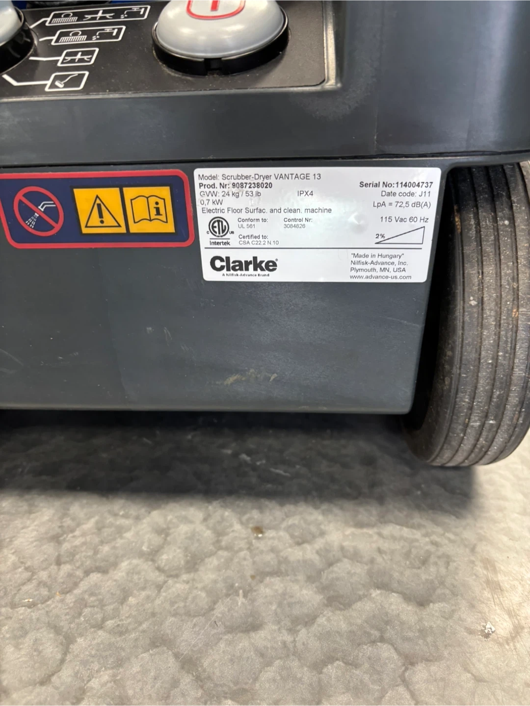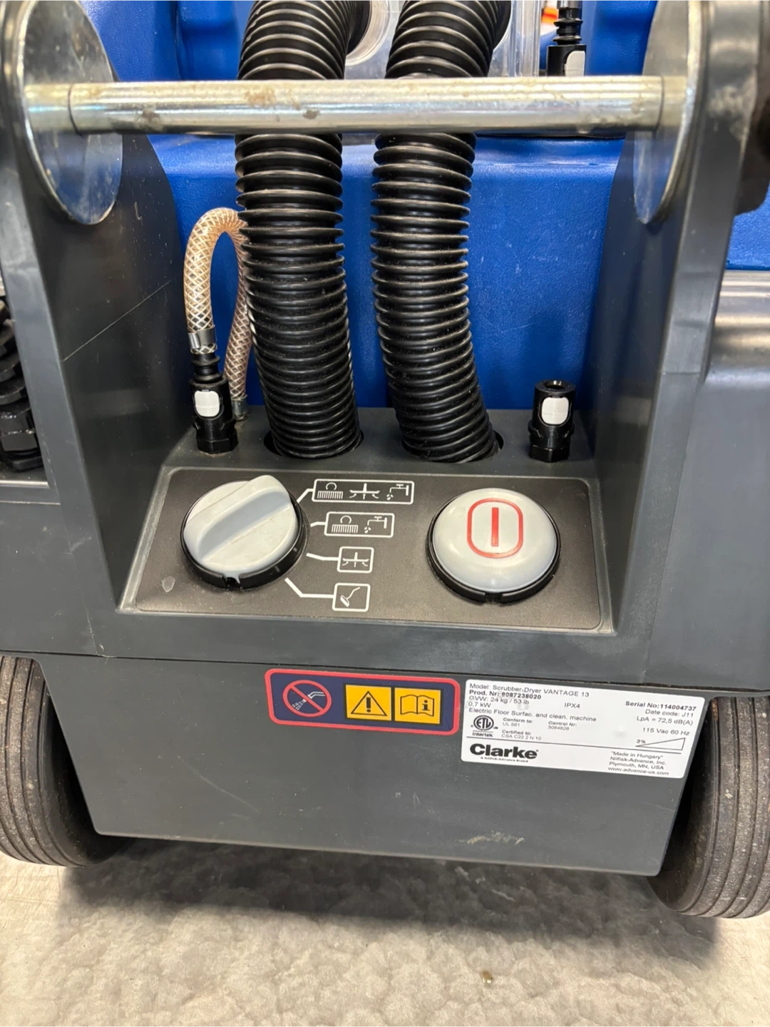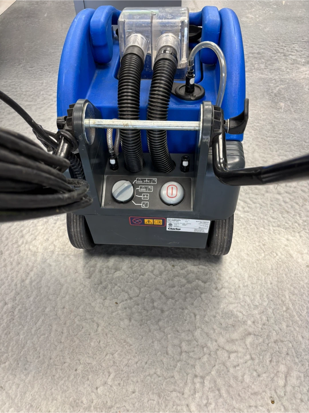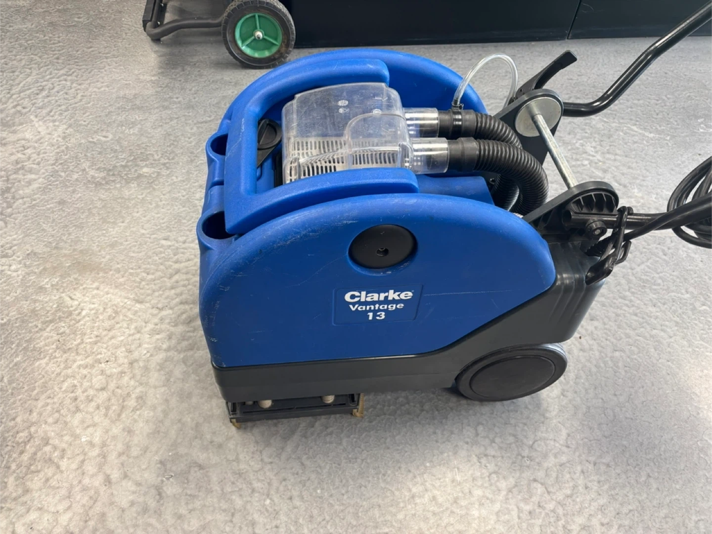 This is a Clarke Vantage 13 floor scrubber. It's a blue and black unit with a handle and wheels for mobility. It has hoses and a clear tank for water or cleaning solution. Absolutely perfect working condition if you like to come and test the unit before purchase, I am located at.410 16 Ave NE Trans-Canada Building free parking in the back