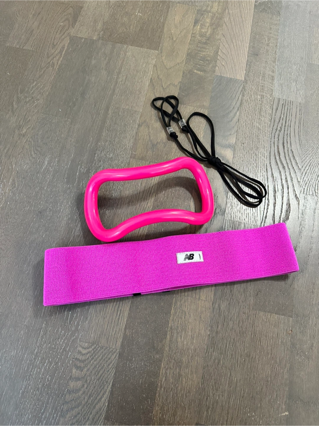 Set includes a New Balance pink resistance band and a pink pilates ring. Also includes a black yoga mat holder. Great for strength training and flexibility workouts!