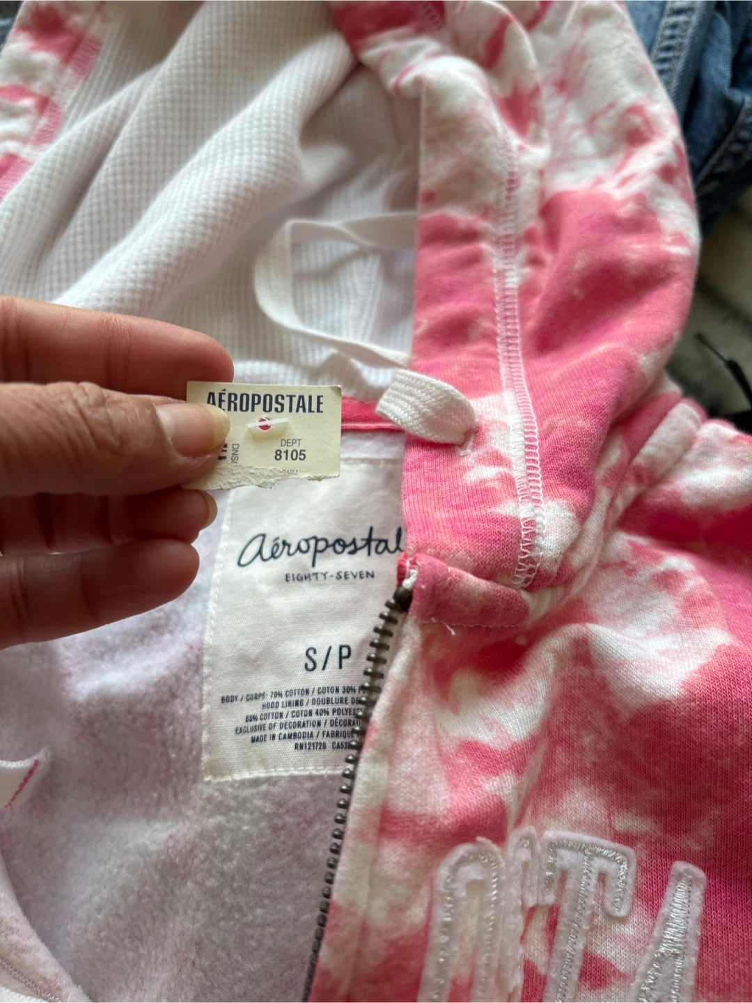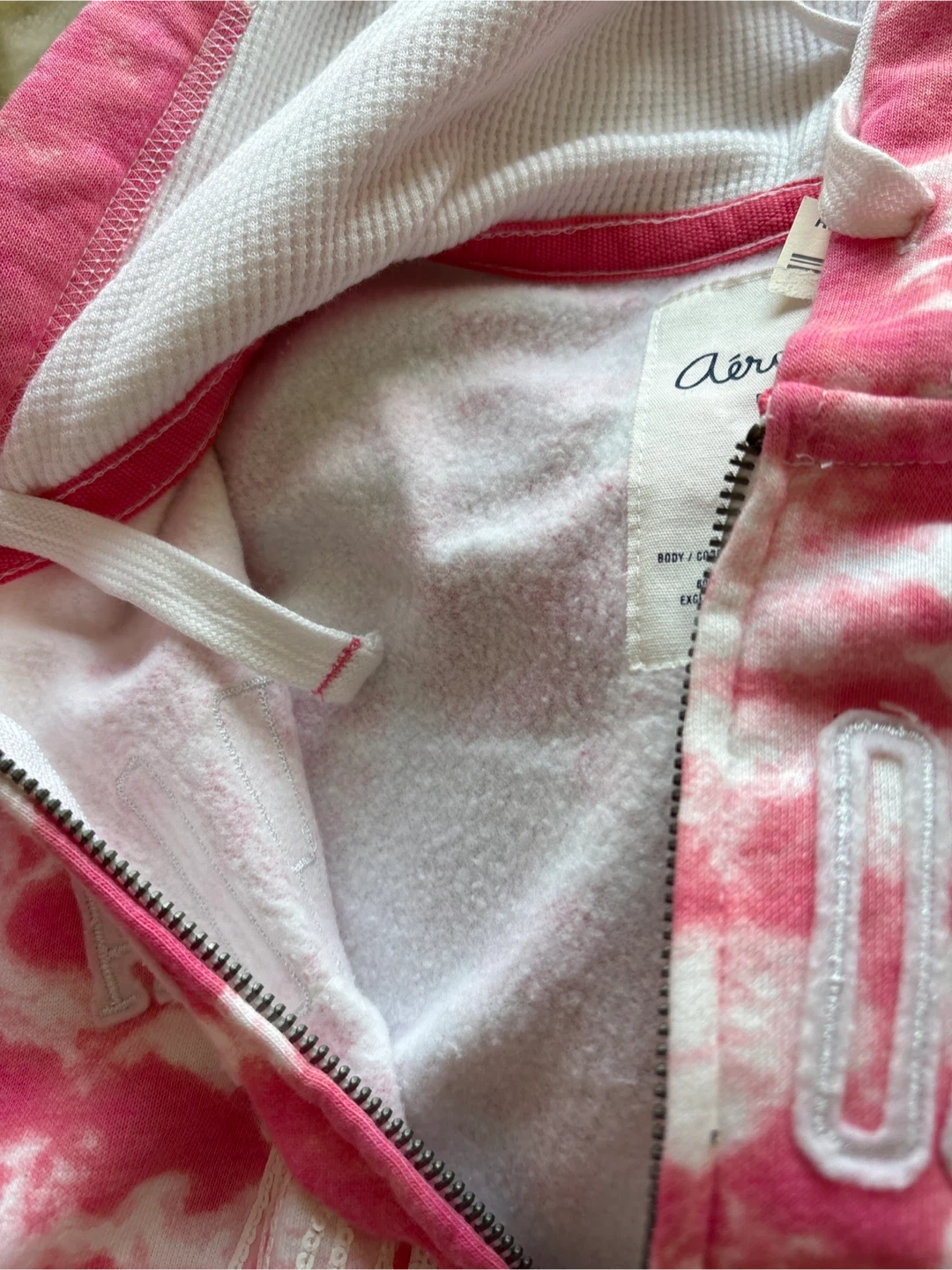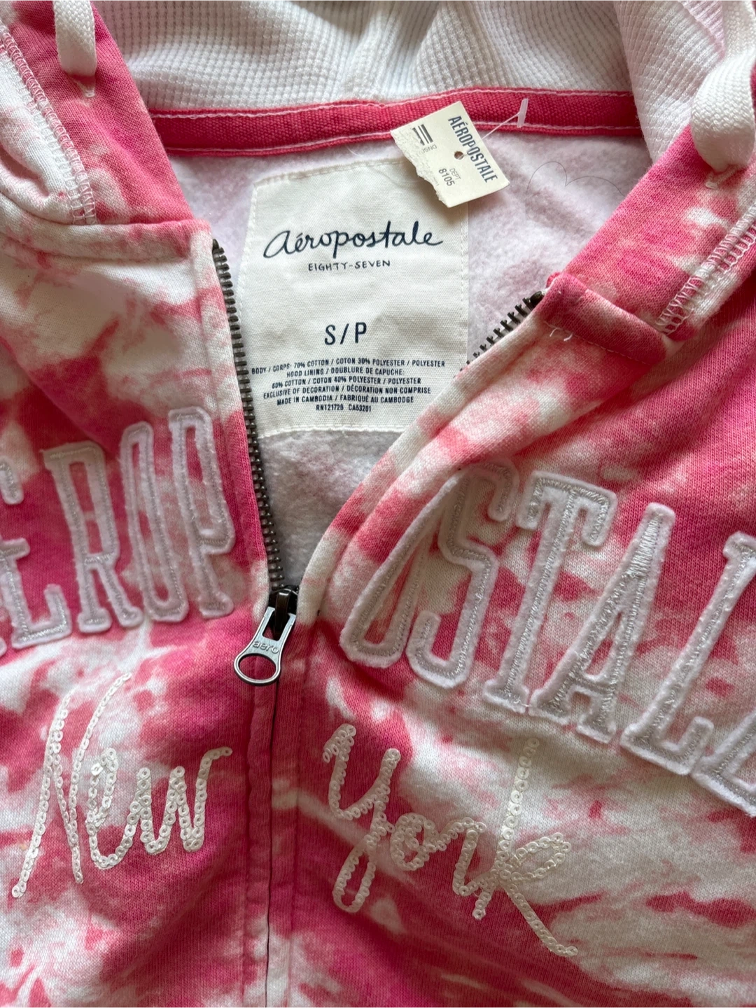 This Aeropostale hoodie features a tie-dye pattern in pink and white. It has "Aeropostale New York" embroidered on the front. Made with a blend of cotton and polyester.