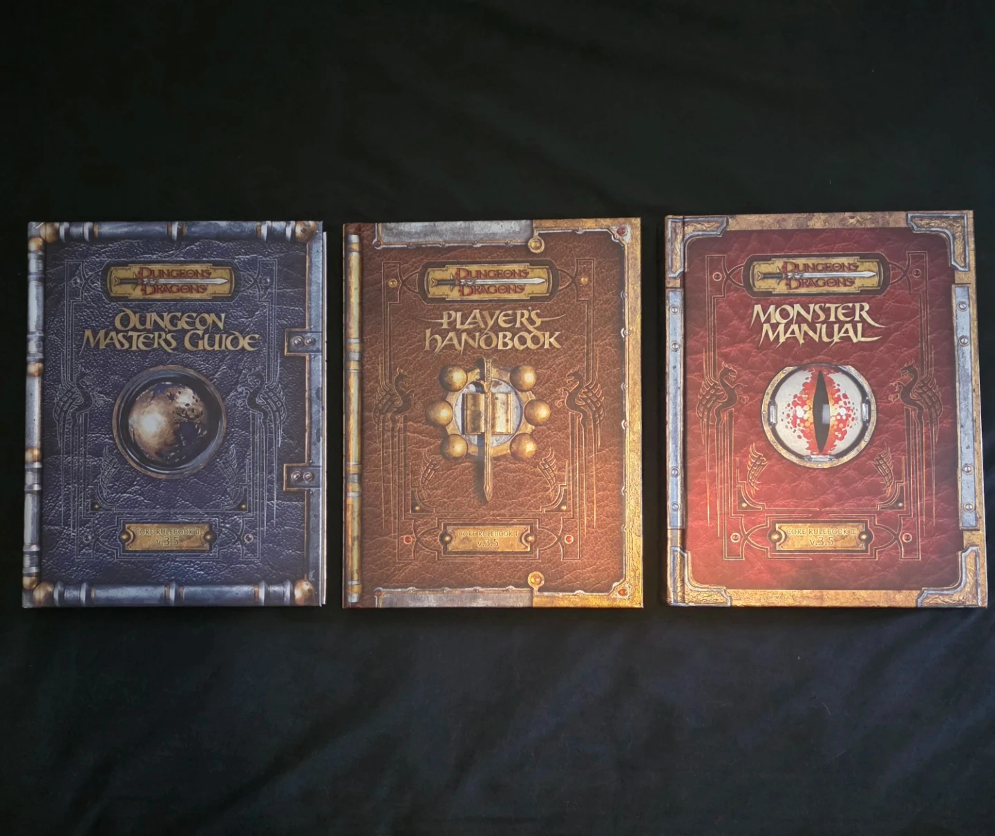 This Hardcover set includes the Dungeon Master's Guide, Player's Handbook, and Monster Manual. These are the core rulebooks for Dungeons & Dragons v.3.5. They're essential for running and playing the game.