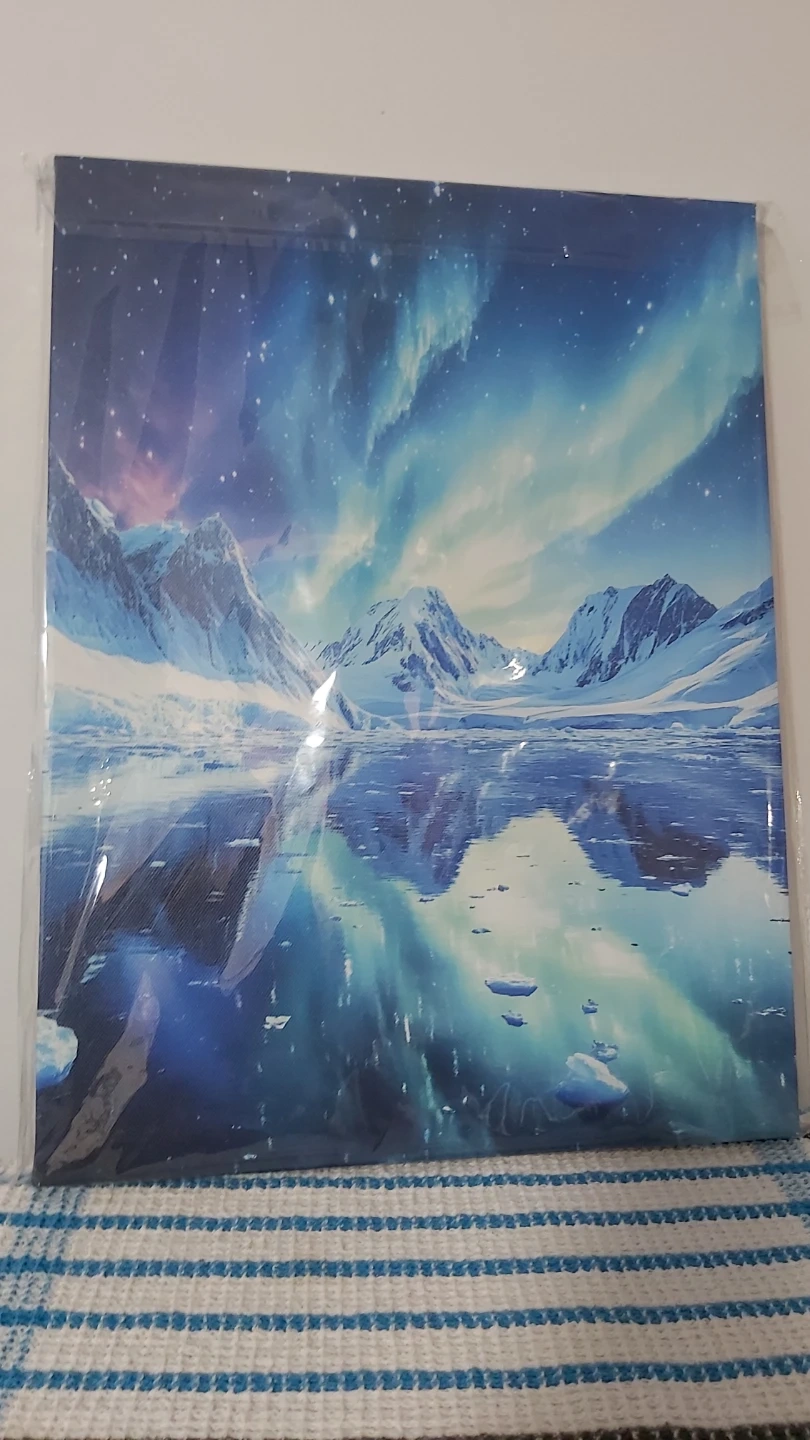 This canvas wall art depicts a stunning aurora borealis over snow-capped mountains and a frozen lake. It's ready to hang and would add a beautiful touch to any room. The vibrant colours and reflections create a serene, natural scene.