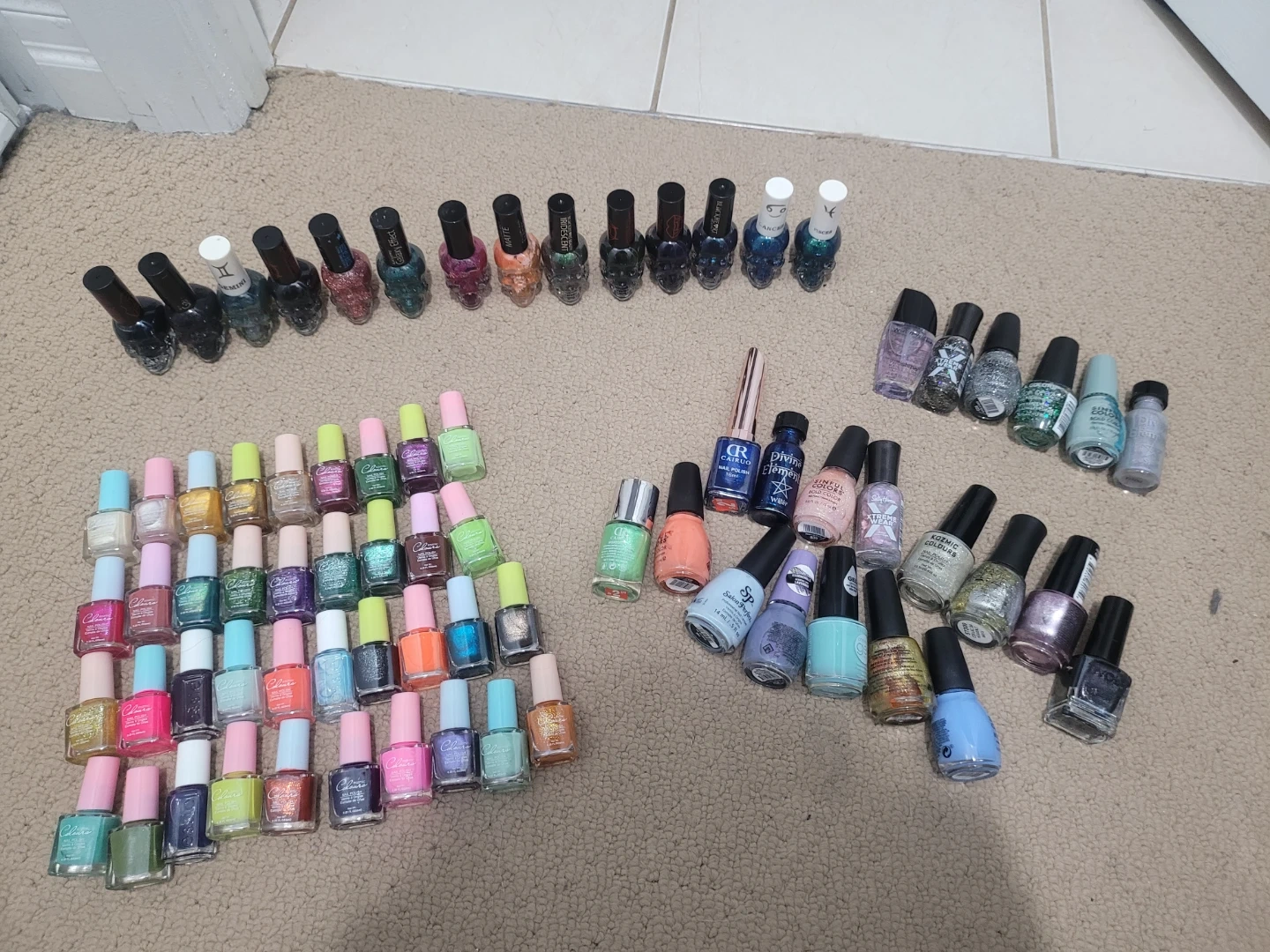 A large collection of nail polishes in various colours and finishes. Includes many brands and shades to choose from. Great for experimenting with different looks! Most are full or unopened!