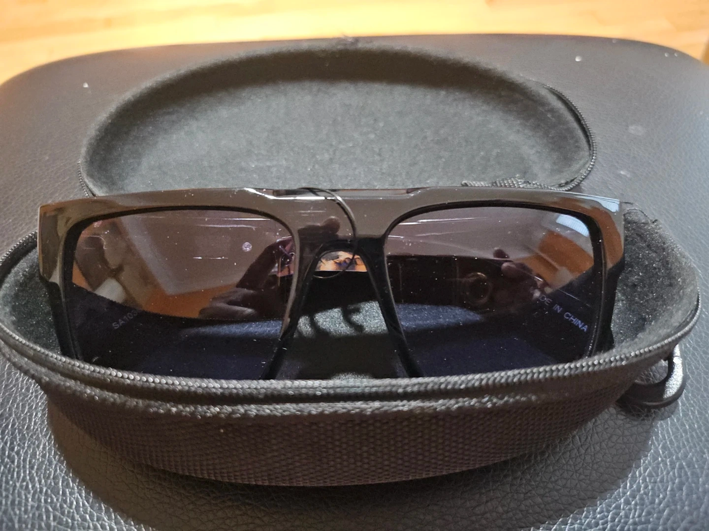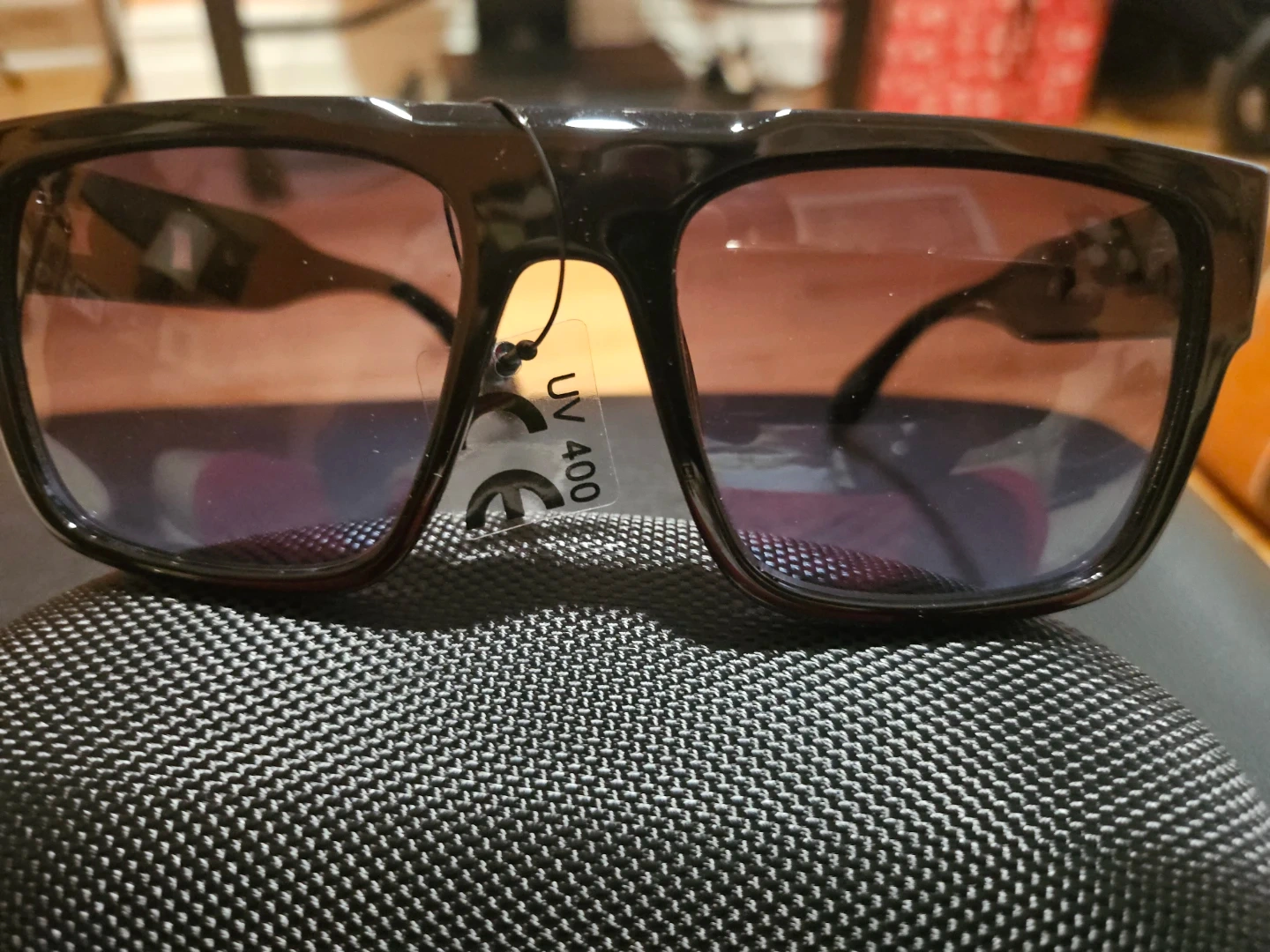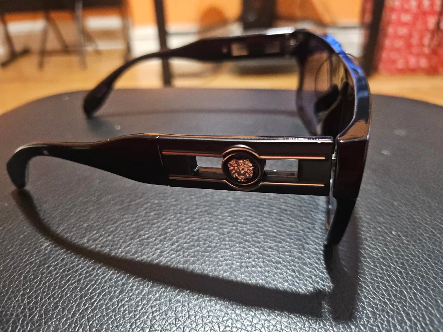 Stylish black sunglasses with a Versace-inspired Medusa head accent on the arms. They offer UV 400 protection. Includes a protective black zippered case. Made in China.