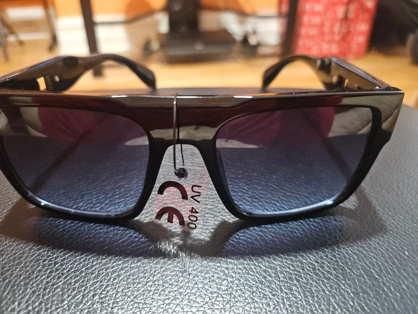 Stylish black sunglasses with a Versace-inspired Medusa head accent on the arms. They offer UV 400 protection. Includes a protective black zippered case. Made in China.
