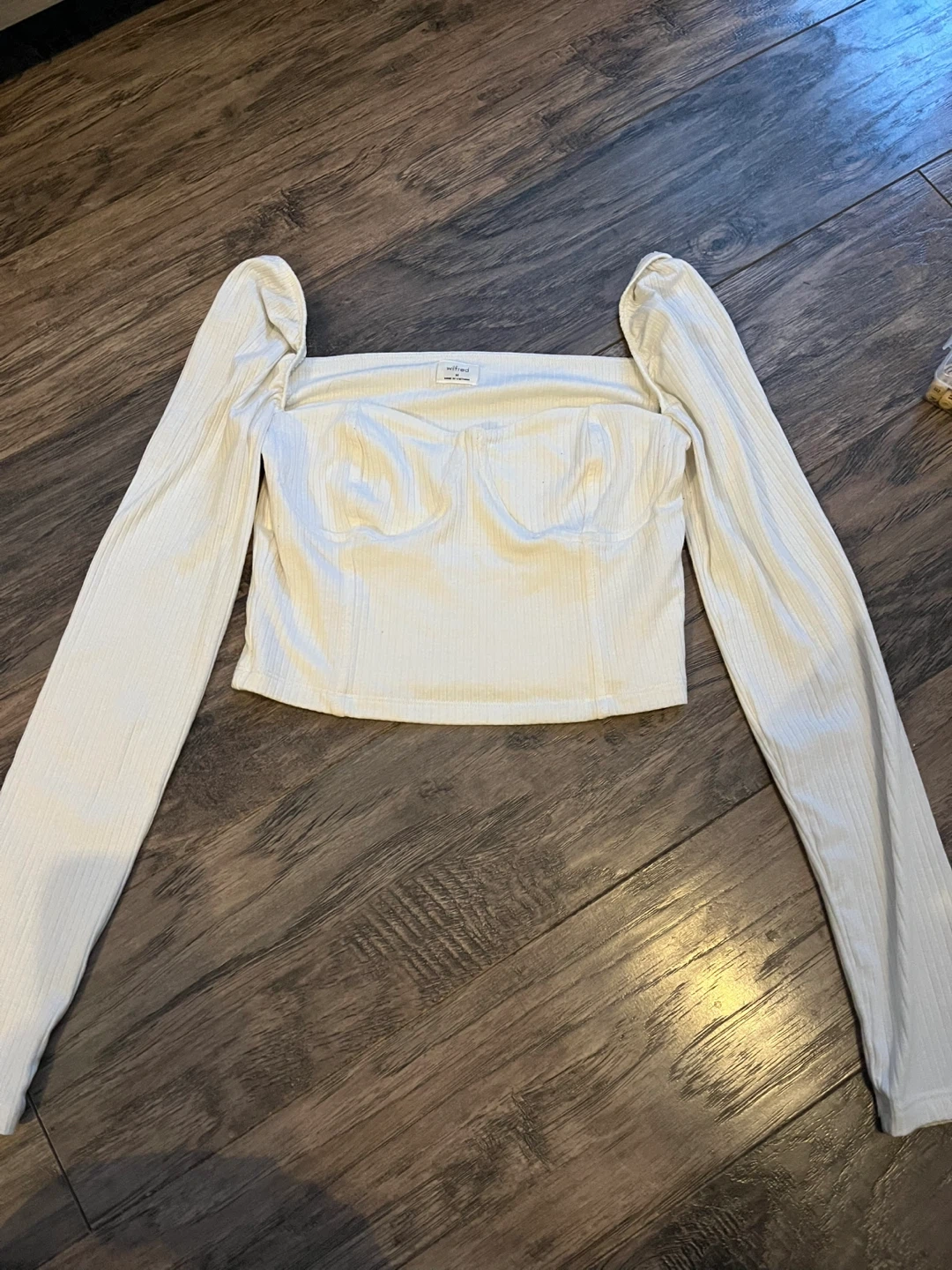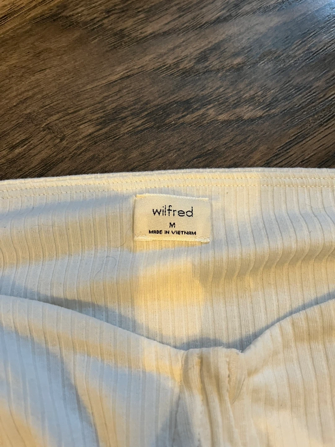 White ribbed long sleeve cropped top in size medium. The brand is Wilfred, and it’s been worn only a couple times. It’s not worn out, stained, or damaged at all. Comes from a smoke free and pet free home