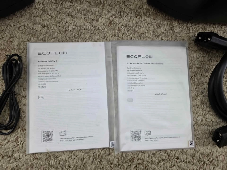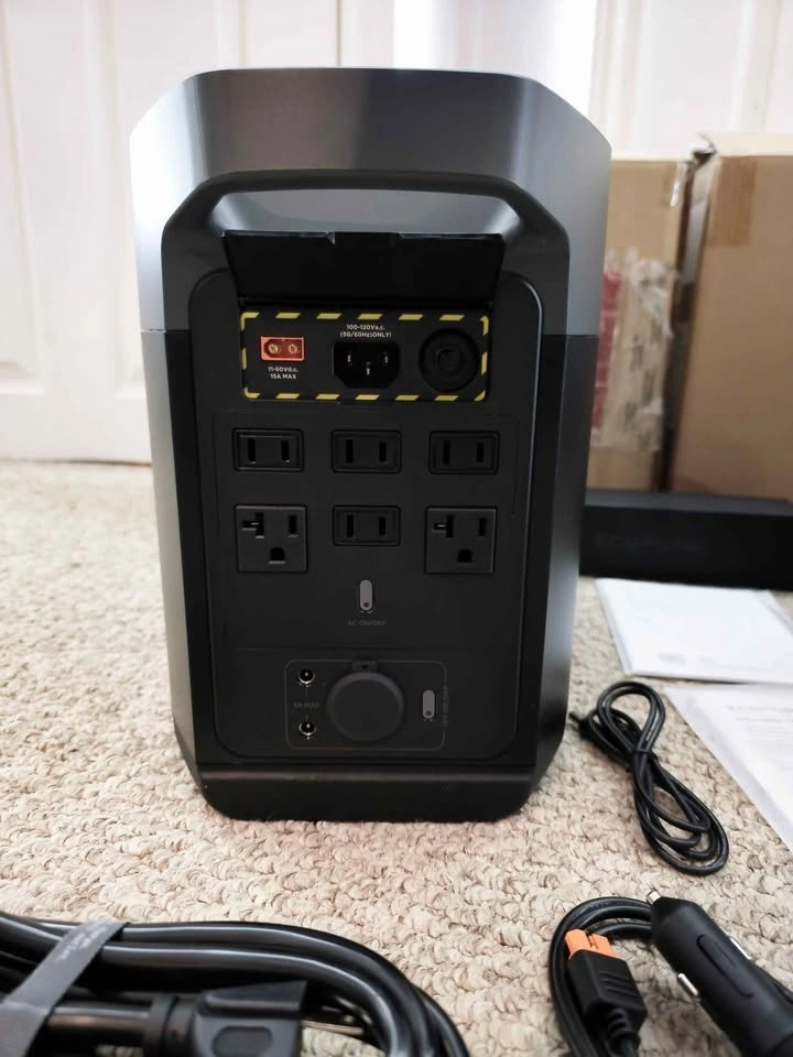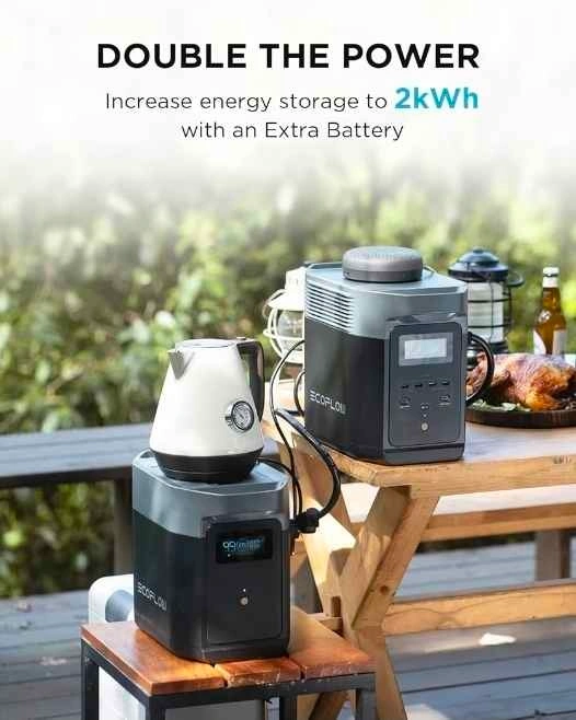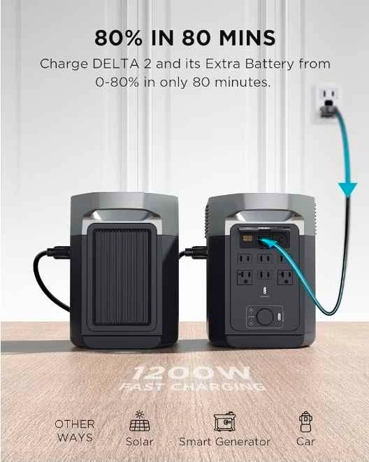 EcoFlow DELTA 2 with Smart Extra Battery. Total Capacity: 2048Wh (expandable energy storage). Output: 1800W AC output (powers 90% of home appliances). Features 15 total outlets including AC, USB-A, USB-C, and DC. Fast charging: 0-80% in just 80 minutes. Perfect for home backup, camping, or emergency power.