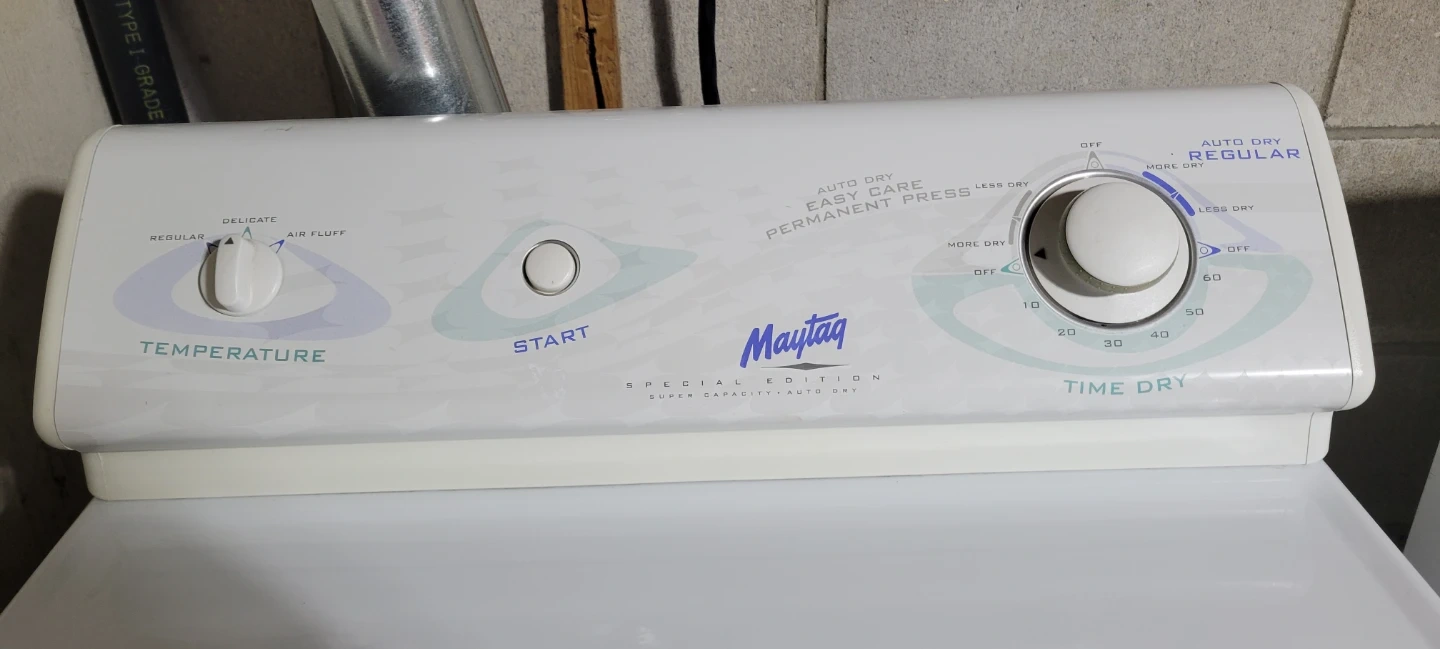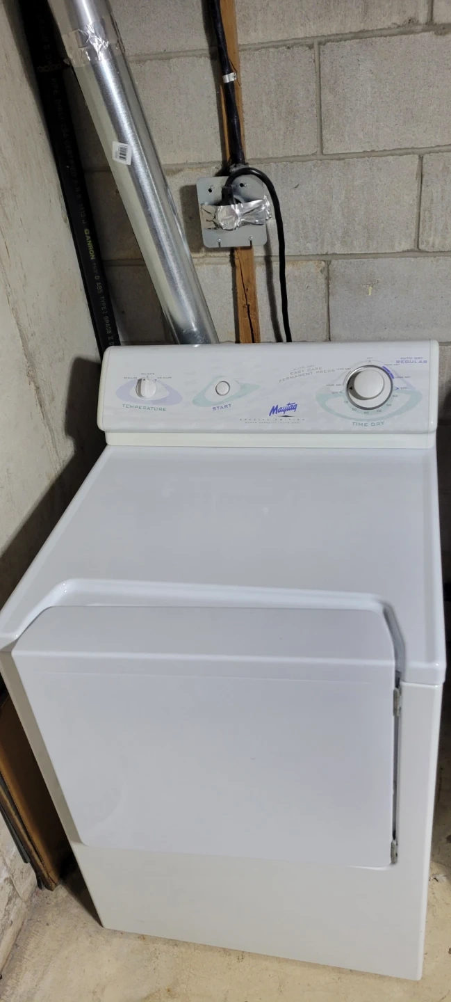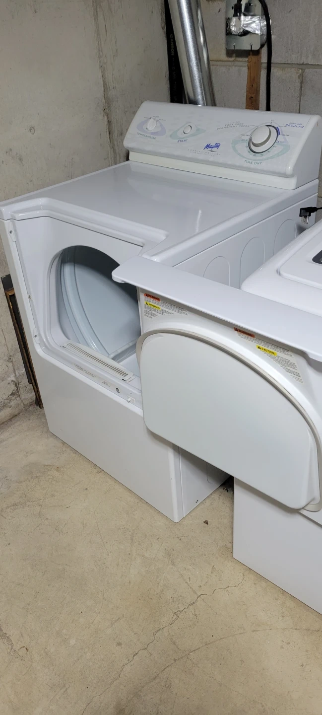 Maytag electric clothes dryer, special edition, super capacity. It features multiple dry cycles including auto dry and time dry. White colour nice and quiet quick and efficient willing to negotiate.