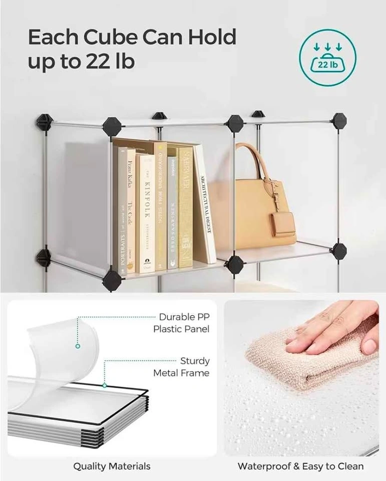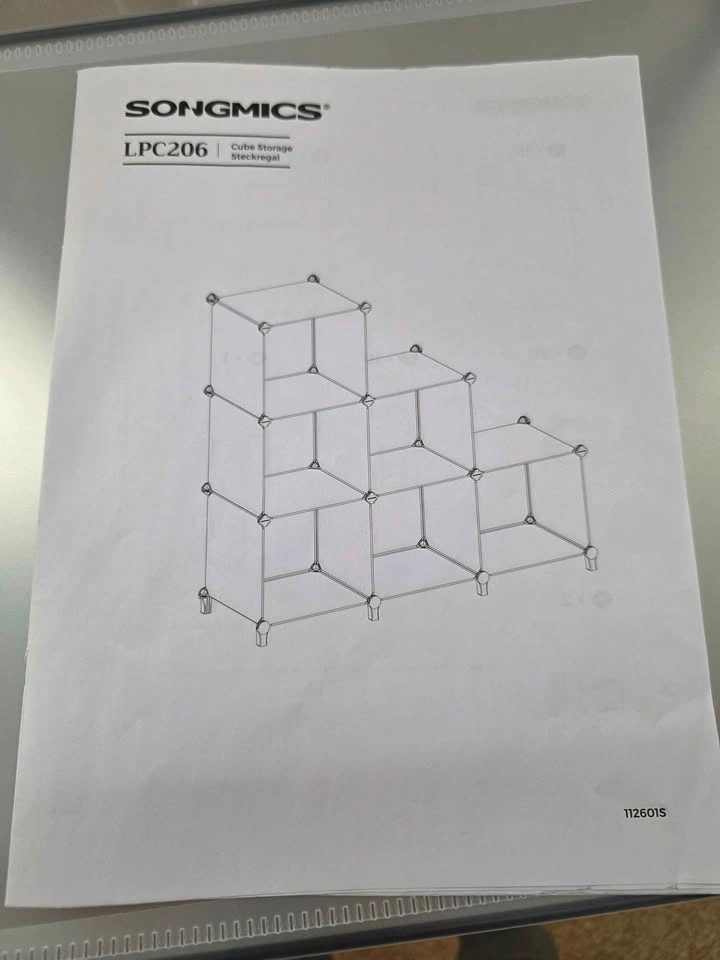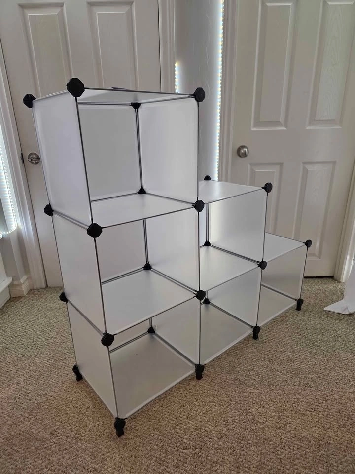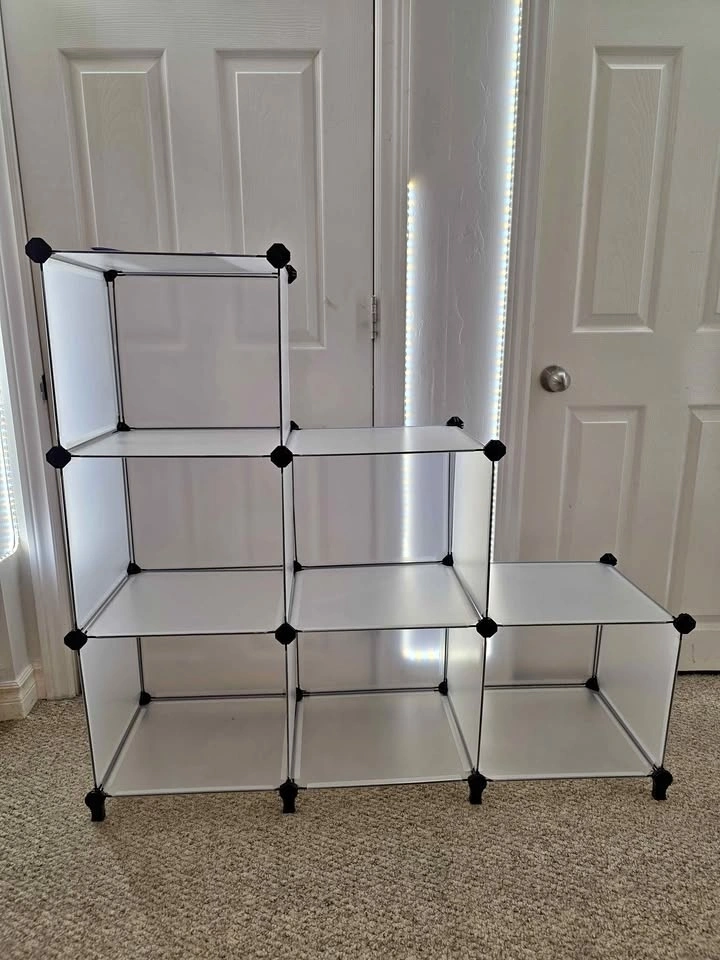 Brand new product from a liquidation pallet. Model: SONGMICS LPC206. Compact 6-cube modular design, can be assembled in a stepped or rectangular shape. Ideal for small spaces, shoe storage, or closet organization. Includes assembly mallet and feet connectors. Available in both Black and White. Dimensions: 37" L x 12.4" W x 38.3" H (in stepped shape). Cube size: 11.8" x 11.8". Let me know if you're interested!