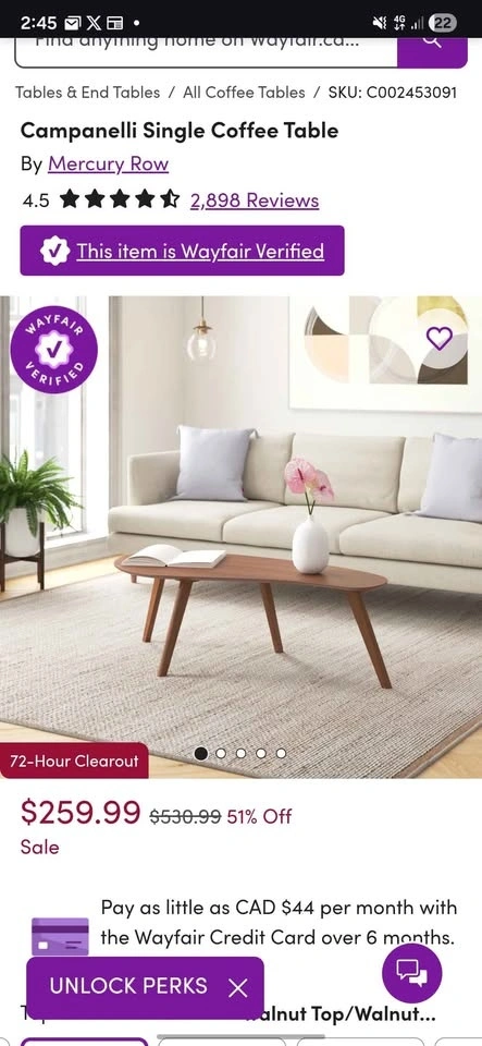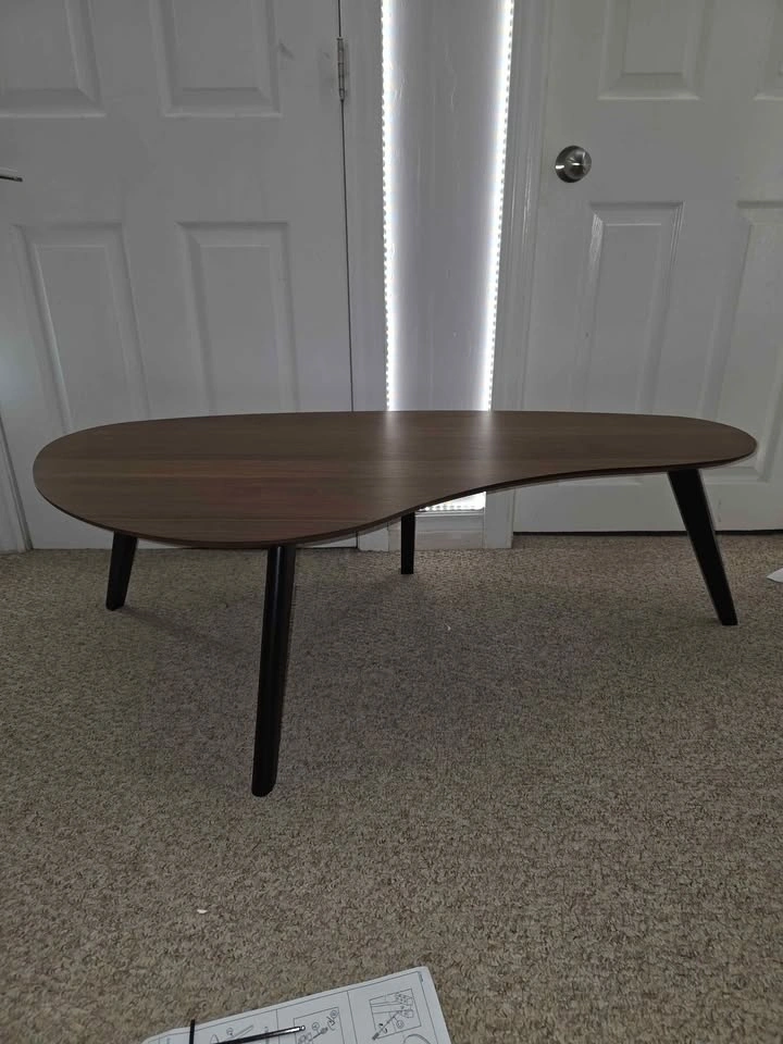 Modern mid-century style coffee table with a smooth walnut-finish top and angled legs. Clean, minimalist design that fits perfectly in living rooms, condos, and apartments.
