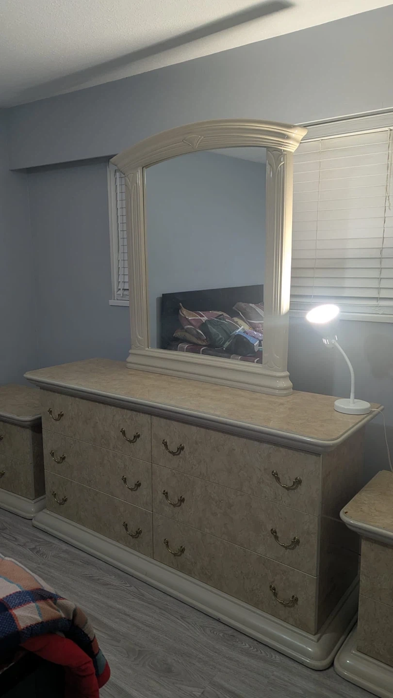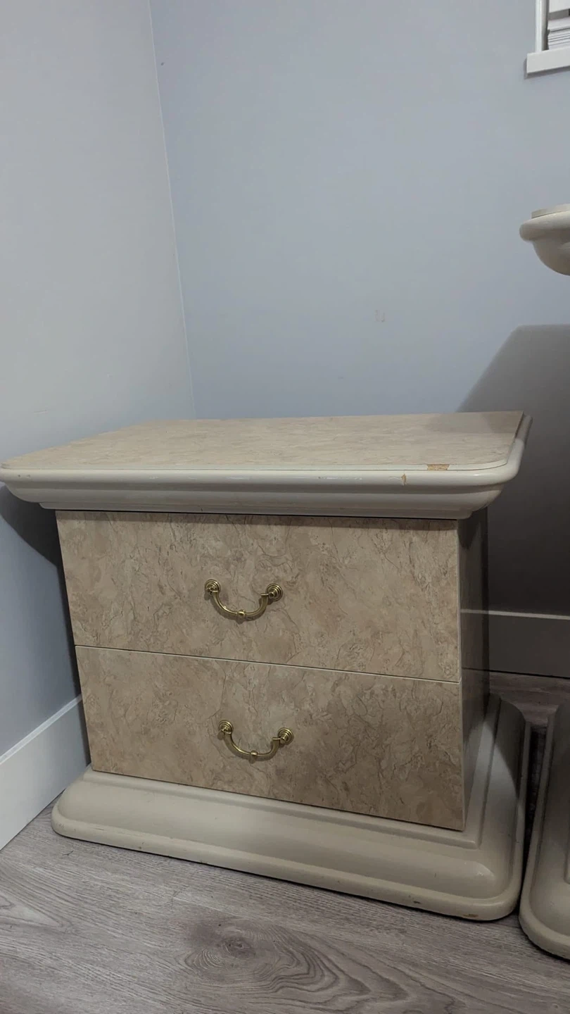 This nightstand features a faux marble finish and two drawers with brass-toned pulls. It has a sleek, modern design. It's perfect for storing bedside essentials.
