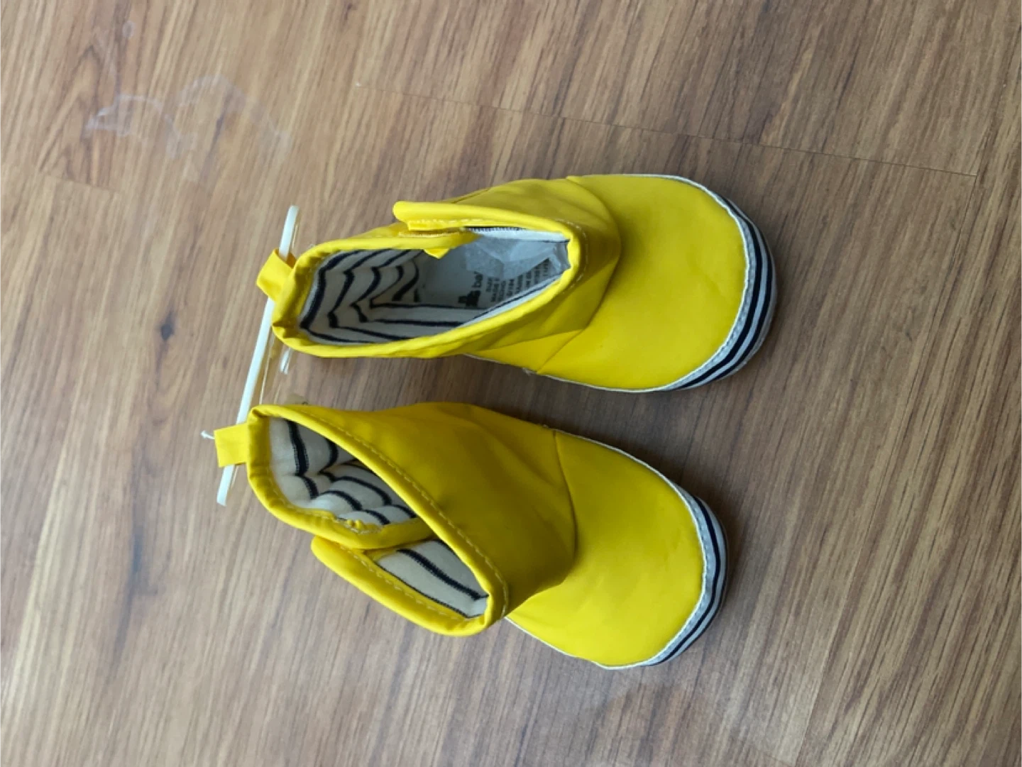 Cute yellow baby boots with a black and white striped interior lining. Easy pull-on tabs at the sides. Ideal for keeping little feet dry on rainy days!