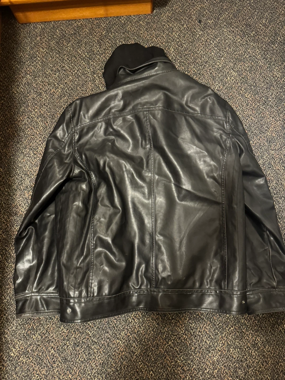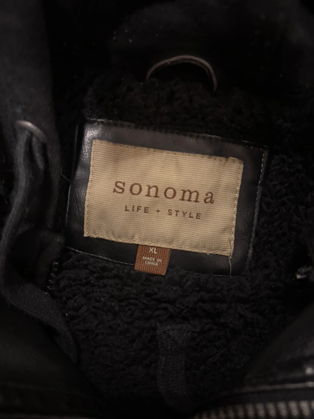 Sonoma Life + Style black faux leather jacket. It's a hooded style with a zip-up front. Size XL, made i