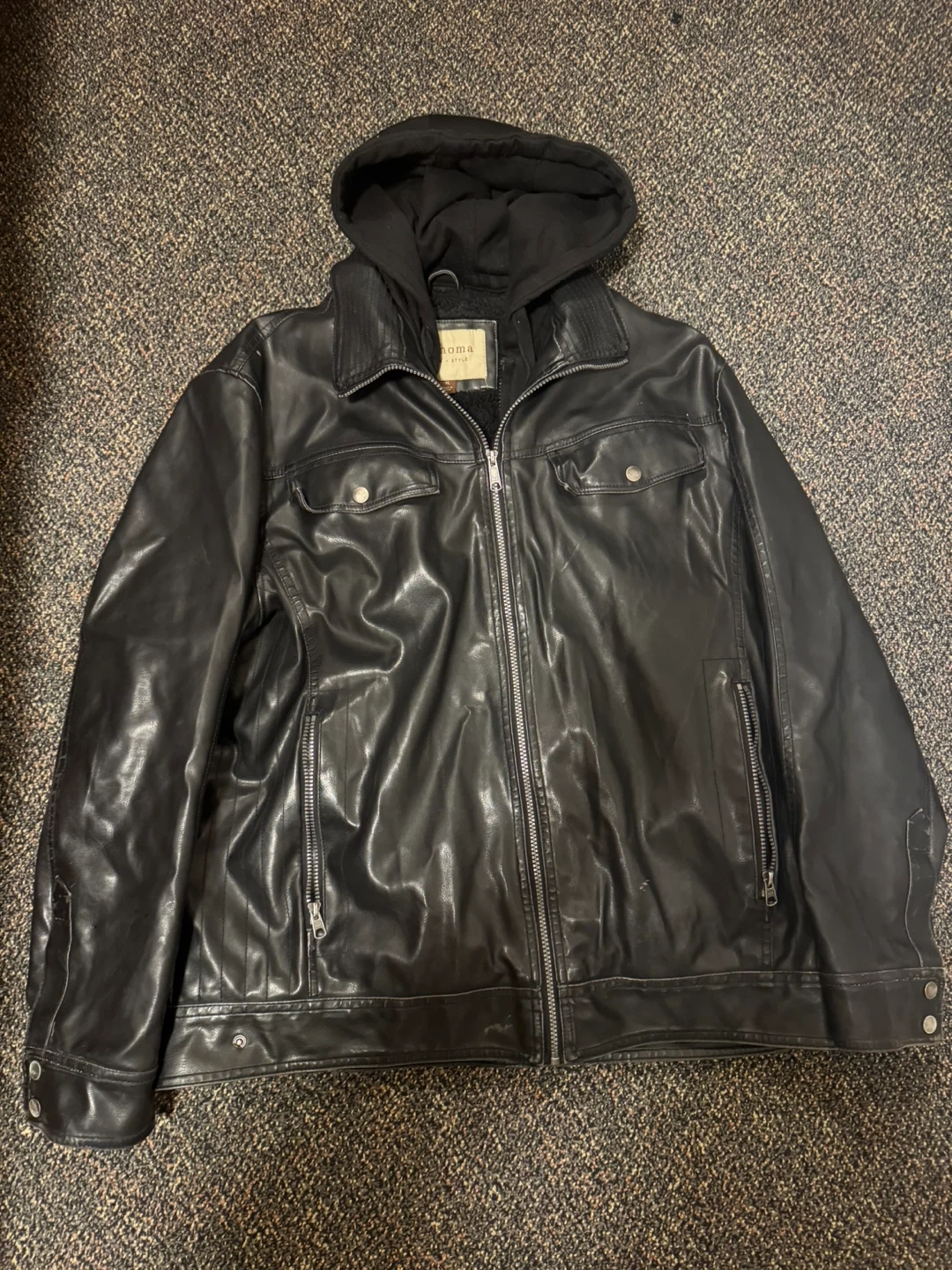 Sonoma Life + Style black faux leather jacket. It's a hooded style with a zip-up front. Size XL, made i