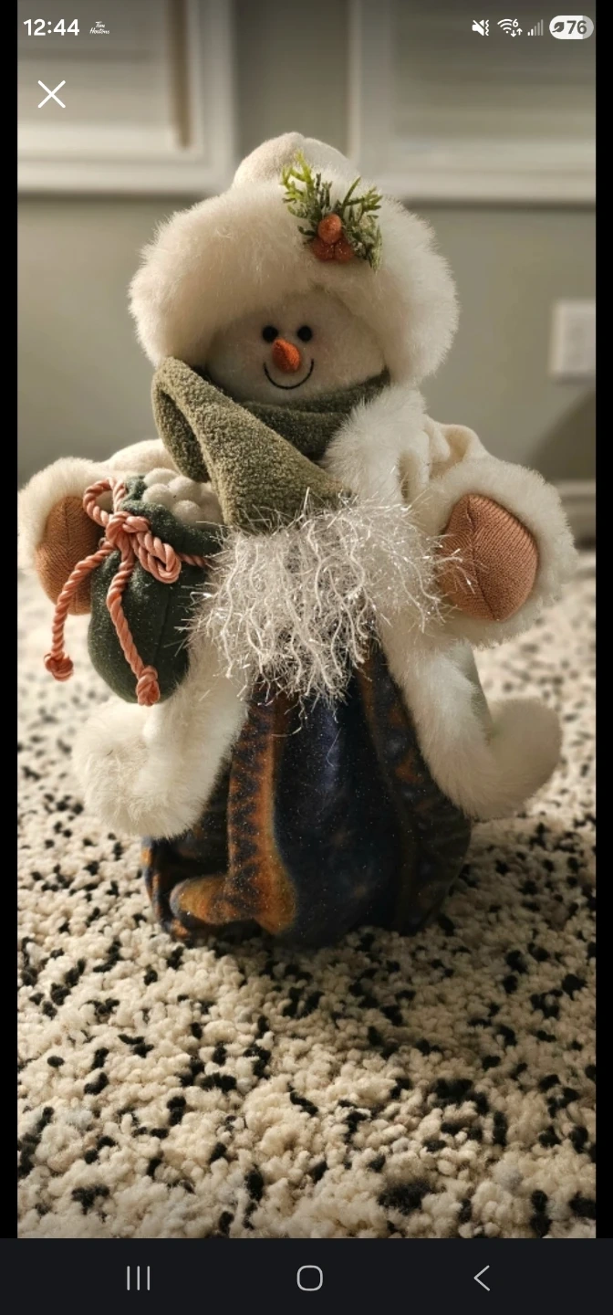 A cute plush snowman decoration, perfect for adding a festive touch to your home this holiday season! It's dressed in a cozy white coat and hat, holding a small green bag. Great for tabletops or mantles.