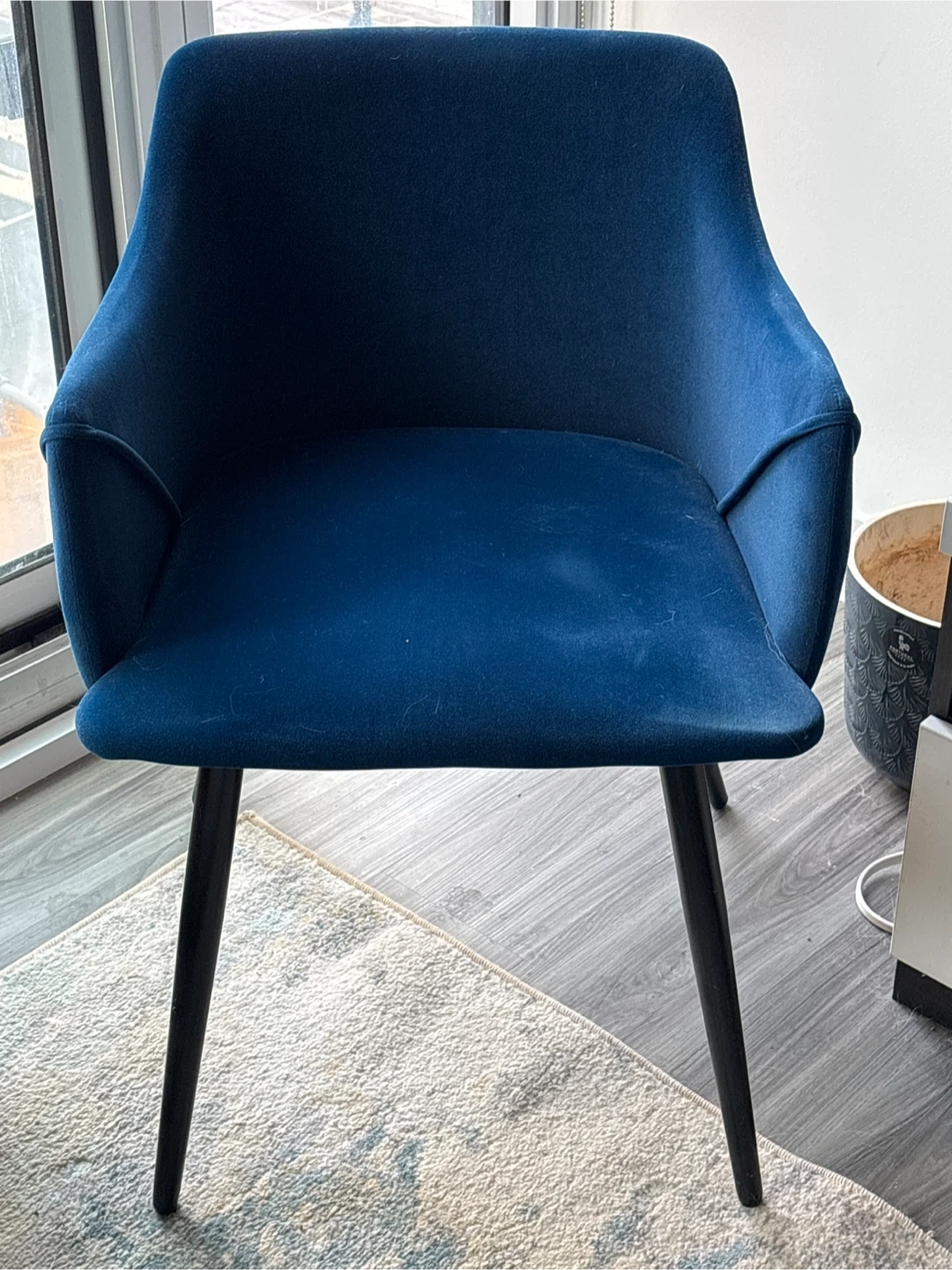 Comfortable navy blue velvet armchair with black legs. Upholstered seat and back. It's a stylish accent piece for any room. This chair offers a cozy spot to relax. Adds a touch of elegance to your living space. Two available.
