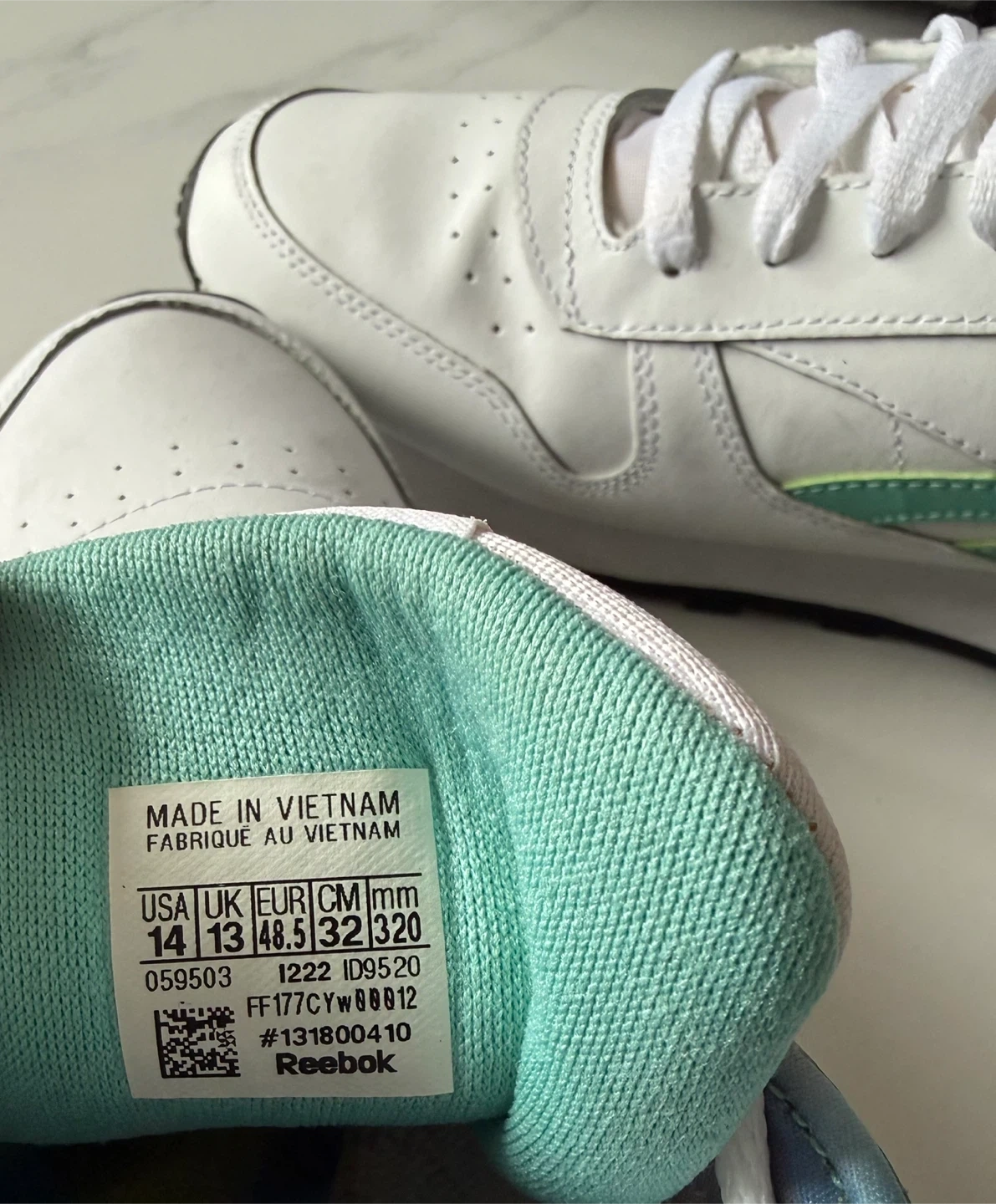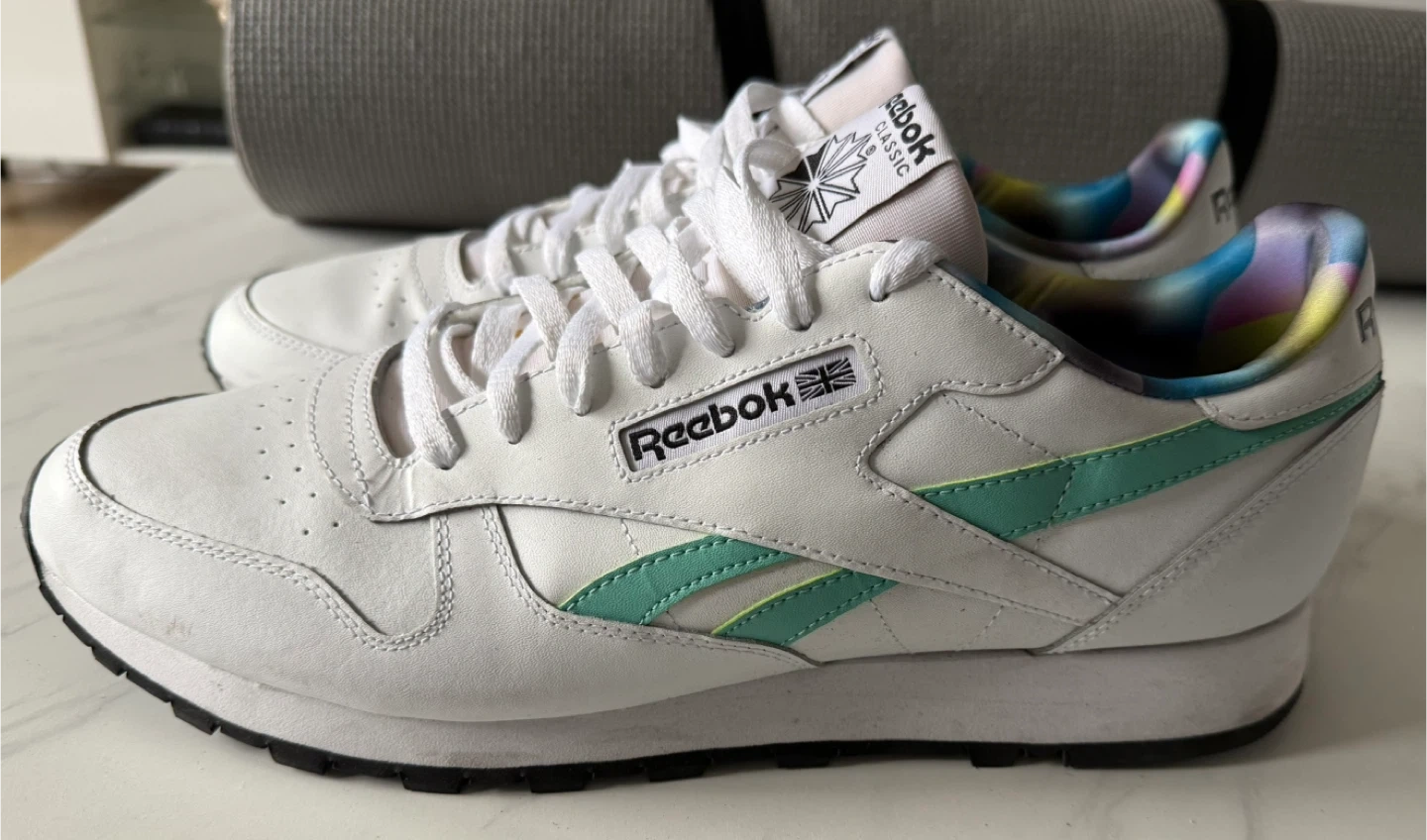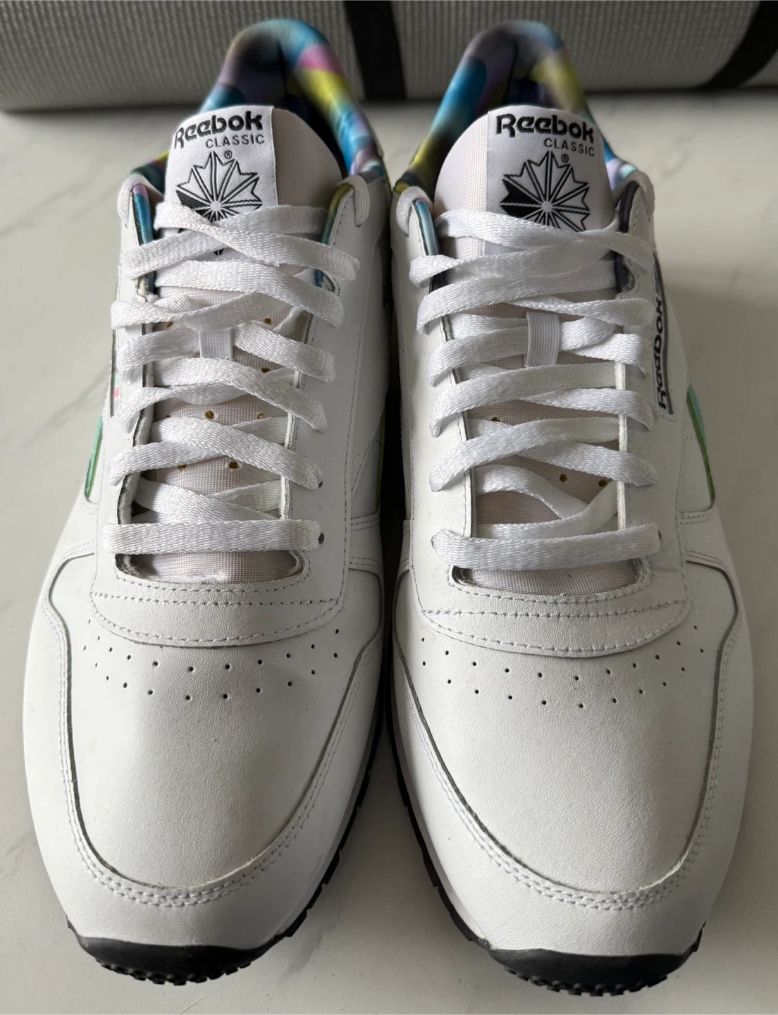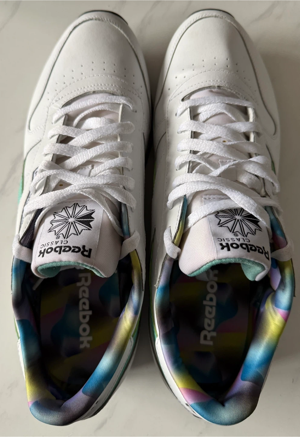 White leather Reebok Classic Leather sneakers with teal and multi-color accents. Features a tie-dye pattern on the inner lining. Size 14